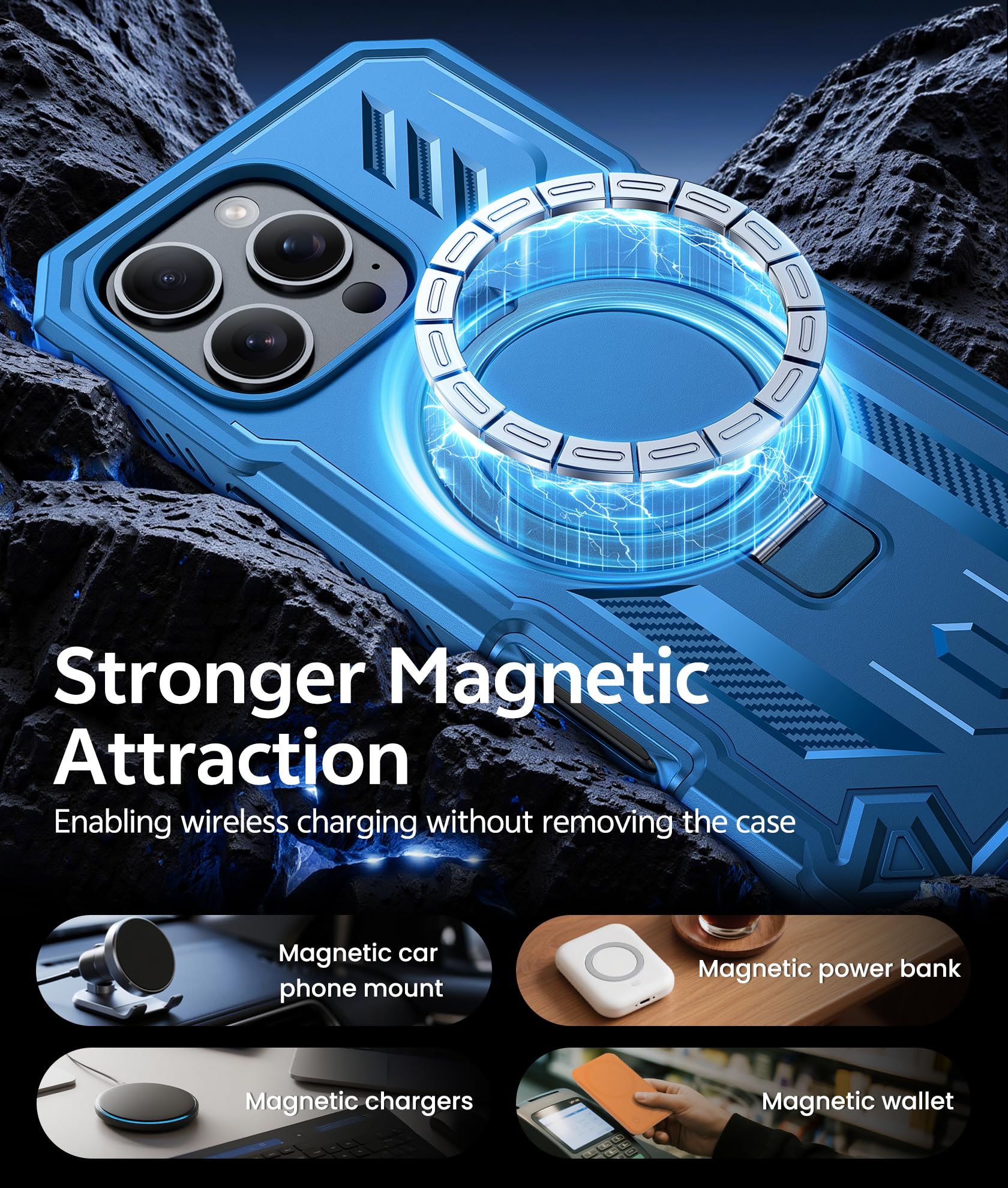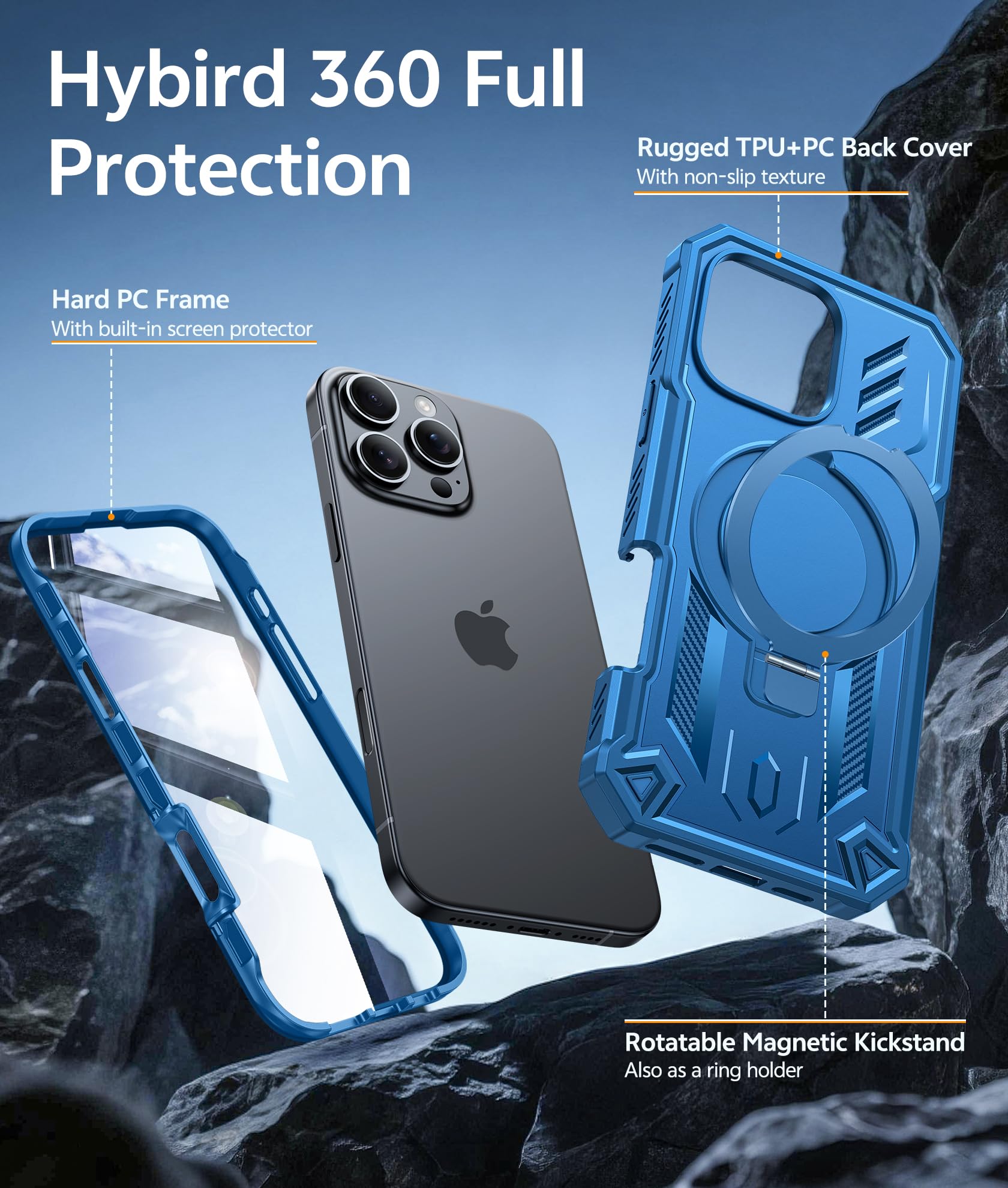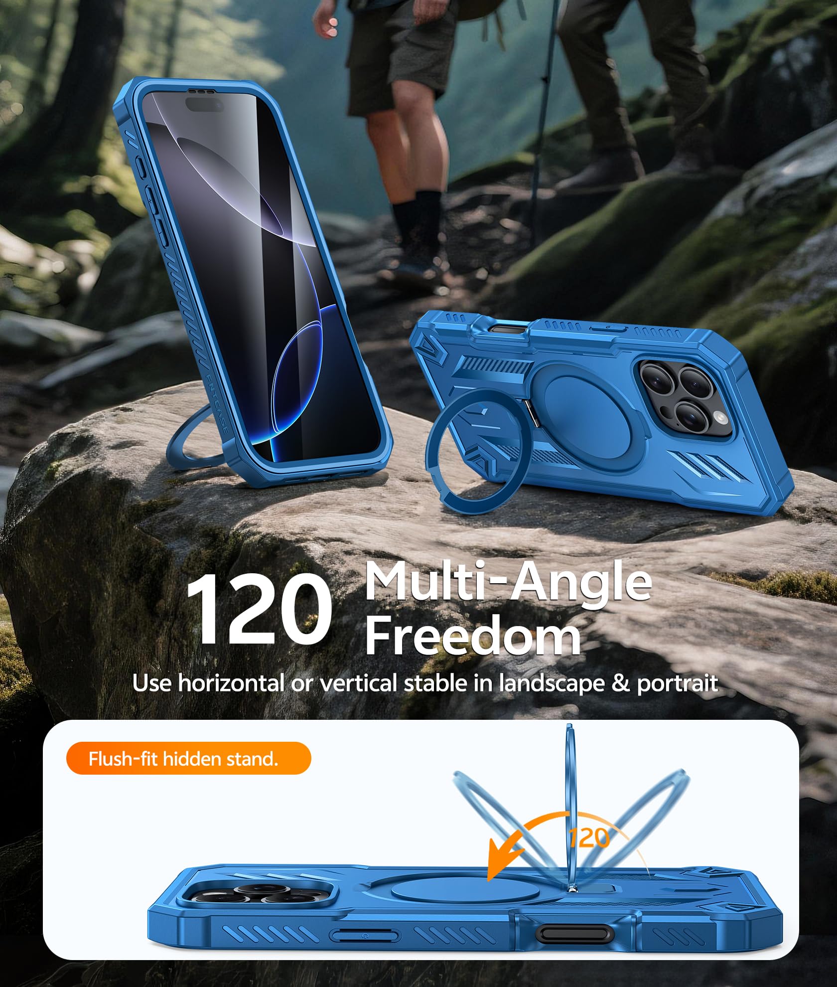 Integrated Magnetic Kickstand: The case with dual-purpose built-in magnetic ring delivers a powerful, secure attachment to all car mounts, and compatible with MagSafe accessories. The integrated kickstand provides stable, adjustable angles for video watching during your commute, portrait video calls at your desk, following recipes in the kitchen, or outdoor entertainment. When closed, it lies perfectly flat for a seamless profile