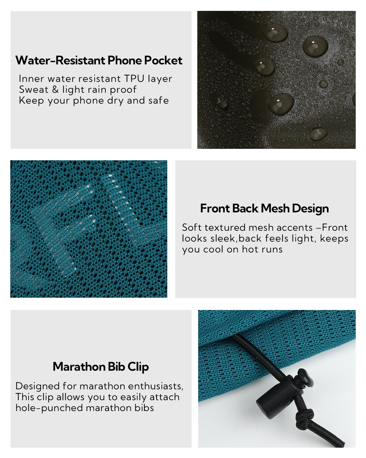 Breathable Mesh Design: The running fanny pack has a breathable mesh on the front and back. The ultra soft, high density, one piece mesh on the back is moisture wicking and quick drying to ensure long lasting comfort. The stylish front mesh design highlights your personality