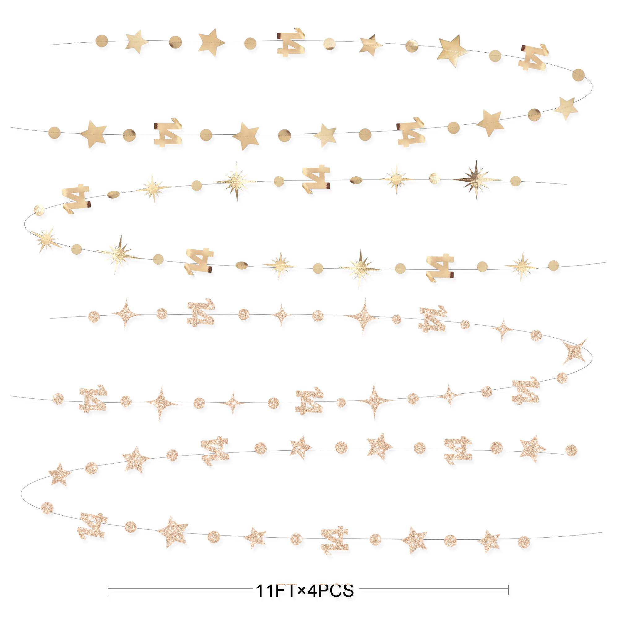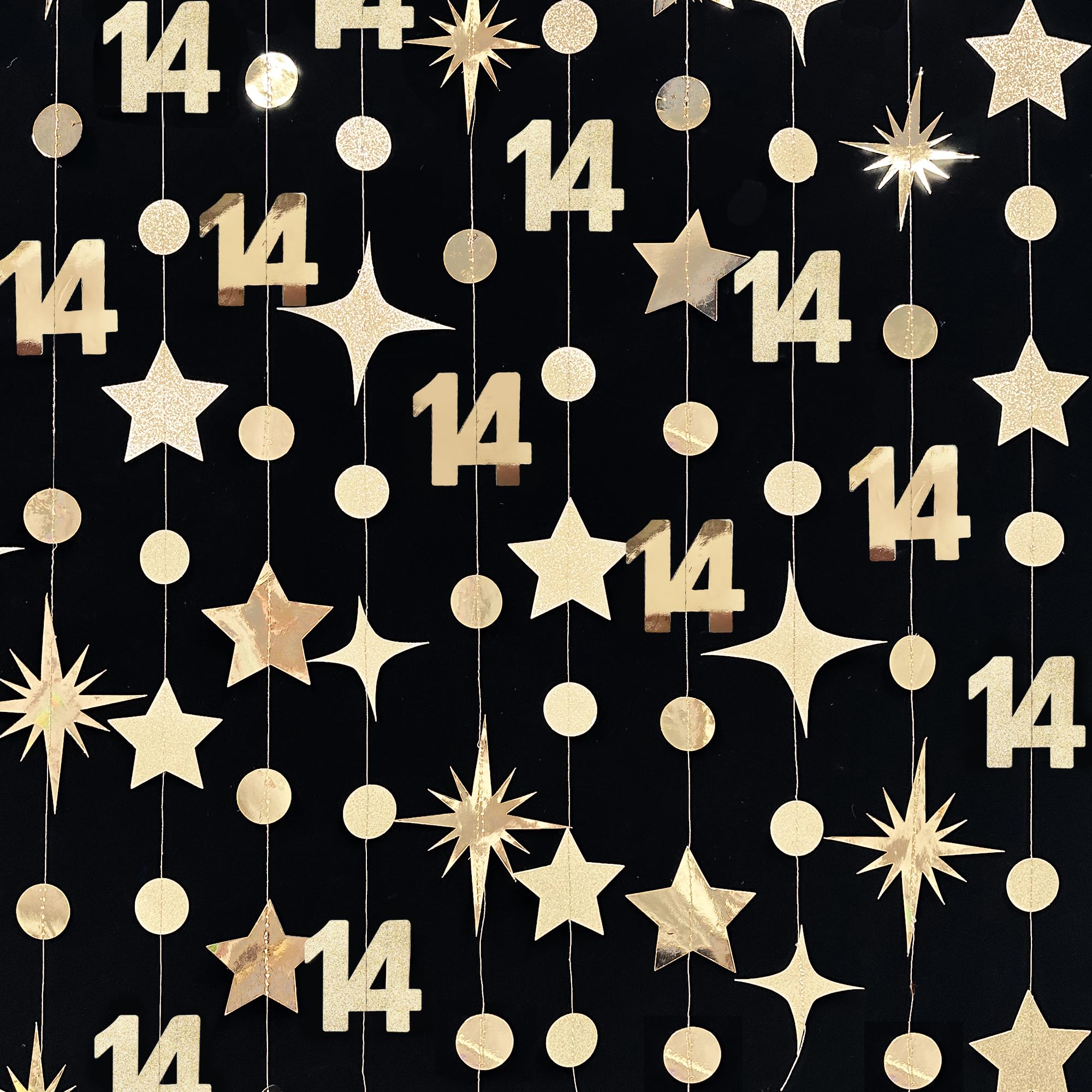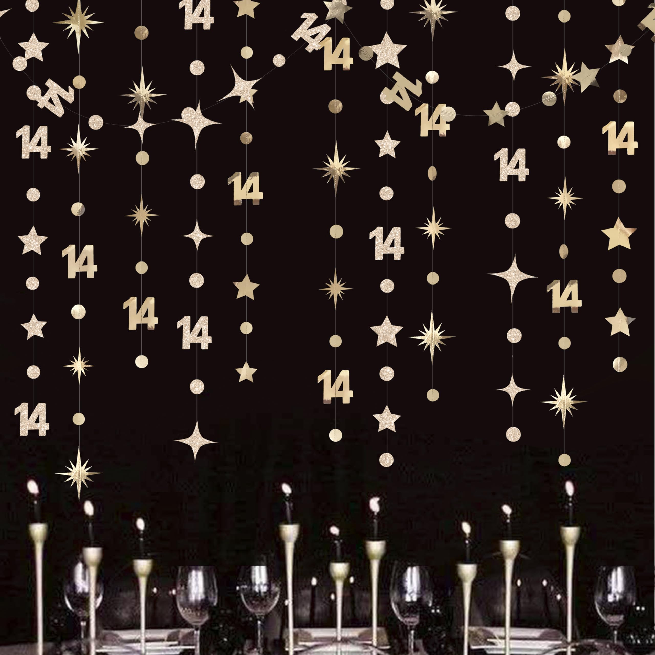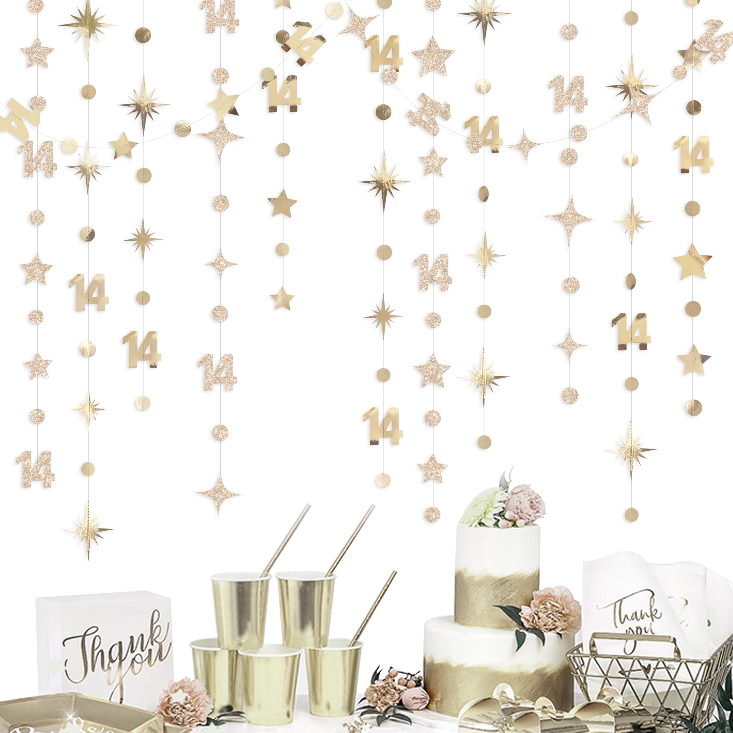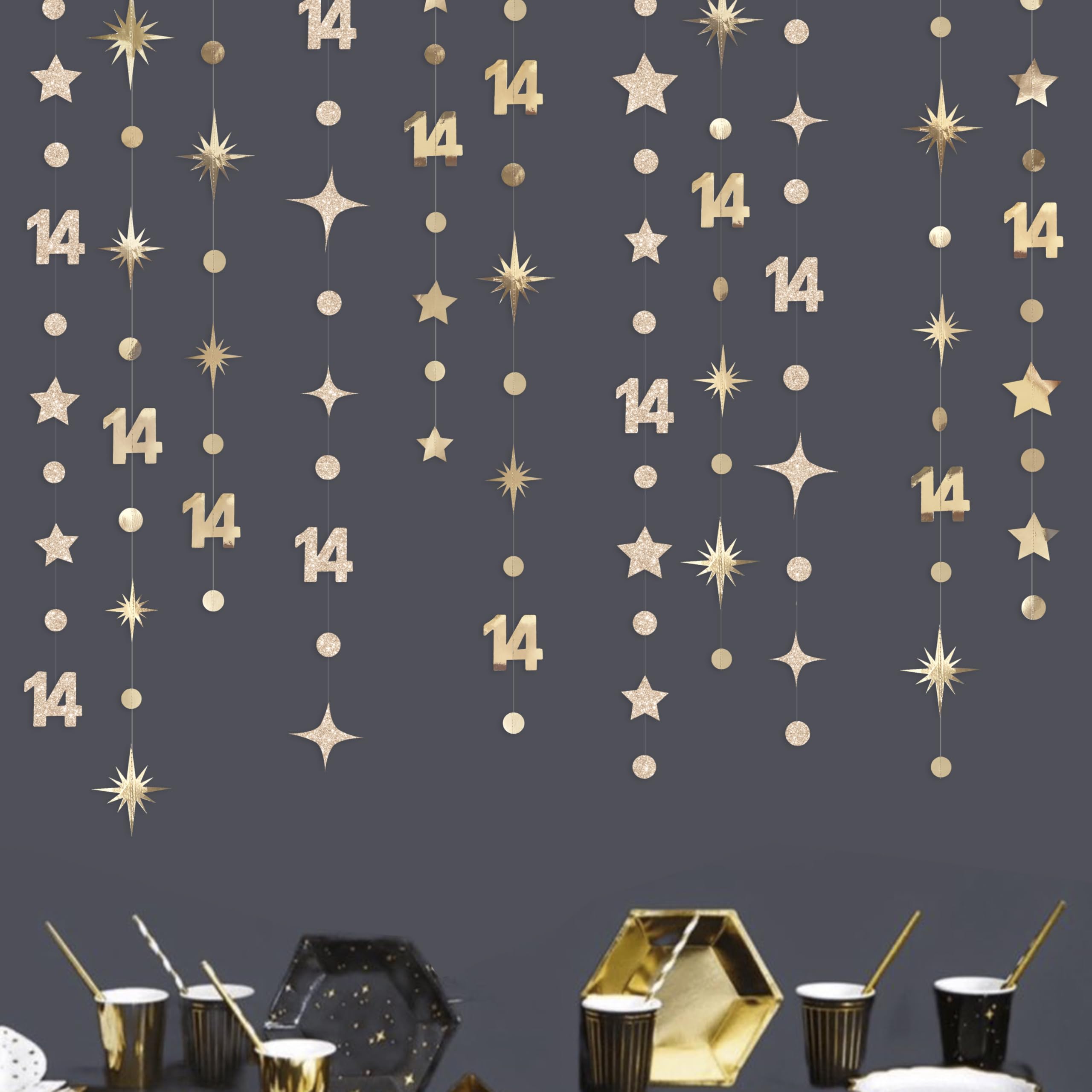 👍 Package includes - 4 strings of 11.5 feet/3.5 meters champagne gold number 14 sparkling twinkle star and circle dots garlands , totally is 46 feet/14 meters.