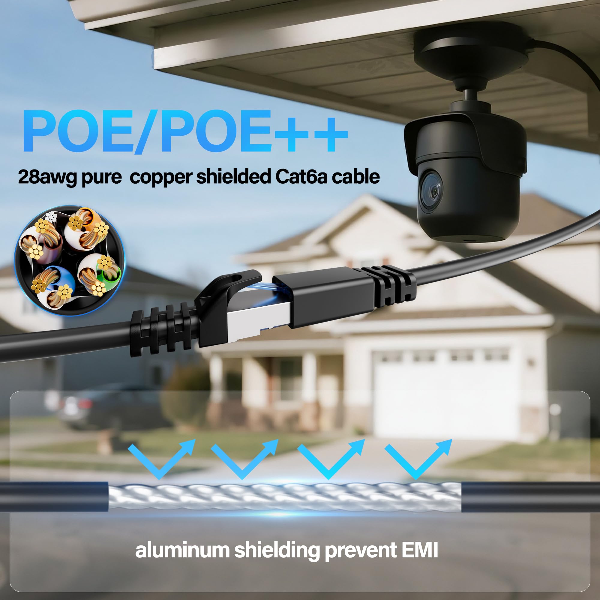 【Support POE】: Cat6a poe cable are made of 28awg pure bare copper, which has excellent conductivity and minimal signal loss. Cat 6 shielded ethernet cable support POE/POE++ for security cameras, VoIP phones, access points and so on. Pure copper wires of ethernet cable cat 6a ensure faster speeds, less resistance and reliable POE++ power supply.