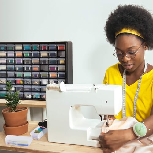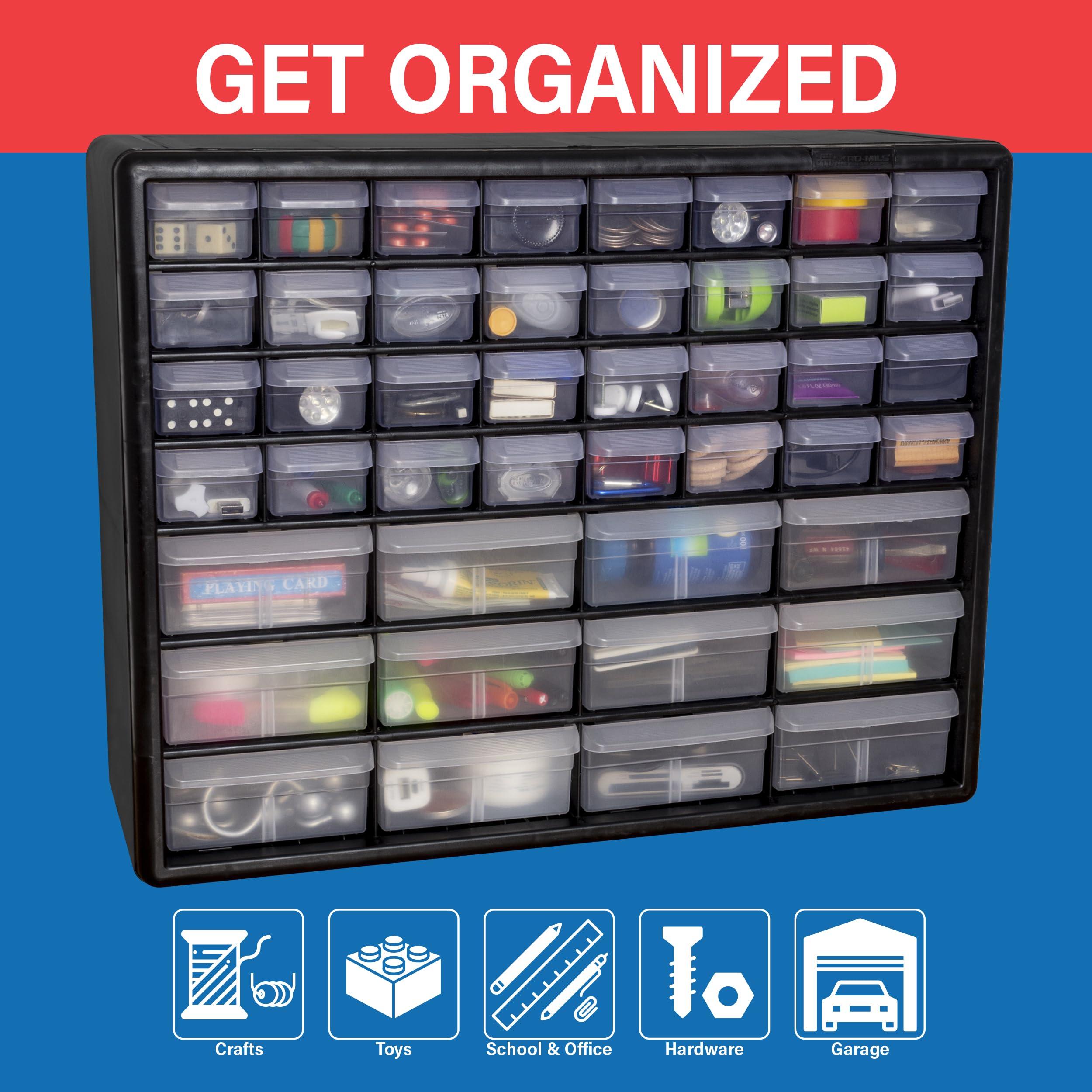The Akro-Mils 10144 44-Drawer Plastic Storage Cabinet Organizer with Drawers is a great solution for all your storage needs. This heavy-duty cabinet is made in the U.S.A. from rugged, high-impact polystyrene plastic and features 44 large and small plastic drawers offering ample storage space for all your small parts and tools. Plastic organizer large drawers inside dimensions: 4-7/8-Inch x 4-1/4-Inch x 2-Inch; small storage drawers inside dimensions: 5-1/4-Inch x 1-11/16-Inch x 1-1/2-Inch. Whether you're looking to organize your garage, workshop, classroom, or home, this storage cabinet has you covered. Garage owners and businesses will love the versatility of this cabinet, with the plastic storage drawers perfect for use as a hardware organizer, screw organizer box, or for battery storage. Keep your nails and other small parts accessible with ease. Teachers can use the cabinet for classroom storage, as a teacher toolbox, art storage, craft storage box, for scrapbook supplies, and more. This plastic storage cabinet is also perfect for home storage and organization. Use it as a lego organizer, craft organizer, hobby organizer, or bead storage organizer. It's even great for makeup storage and organization or for medicine and first aid supplies. And with the ability to stack cabinets securely or wall-mount them using keyhole slots, along with finger-grip drawer pulls and rear stop tabs to prevent contents from spilling, this cabinet has everything you need to keep your items safe and organized. Cabinets have 8 small crosswise dividers and 4 large length dividers included. Included dividers are molded into the back of the cabinet (remove with scissors). Additional dividers can be purchased separately.