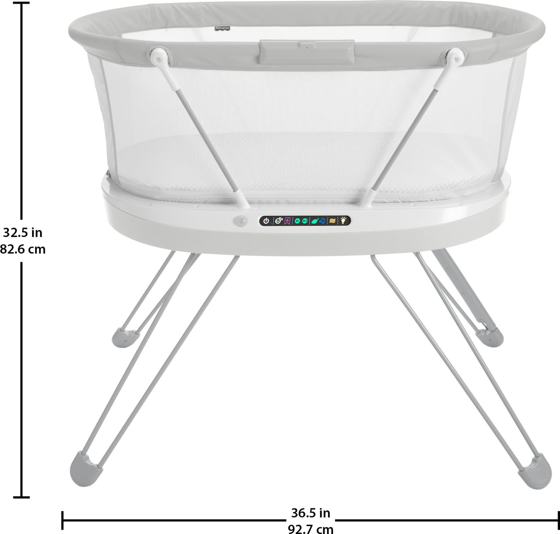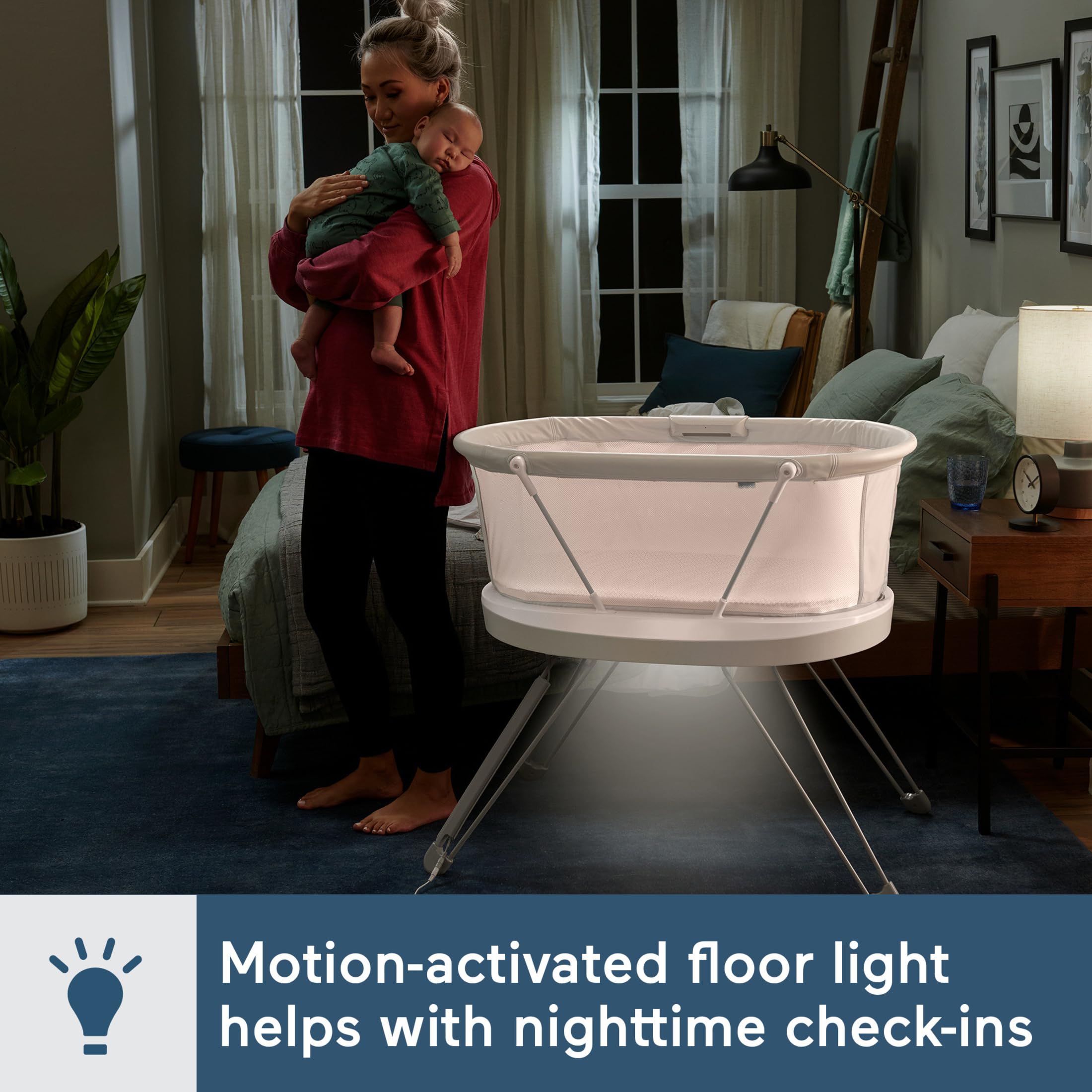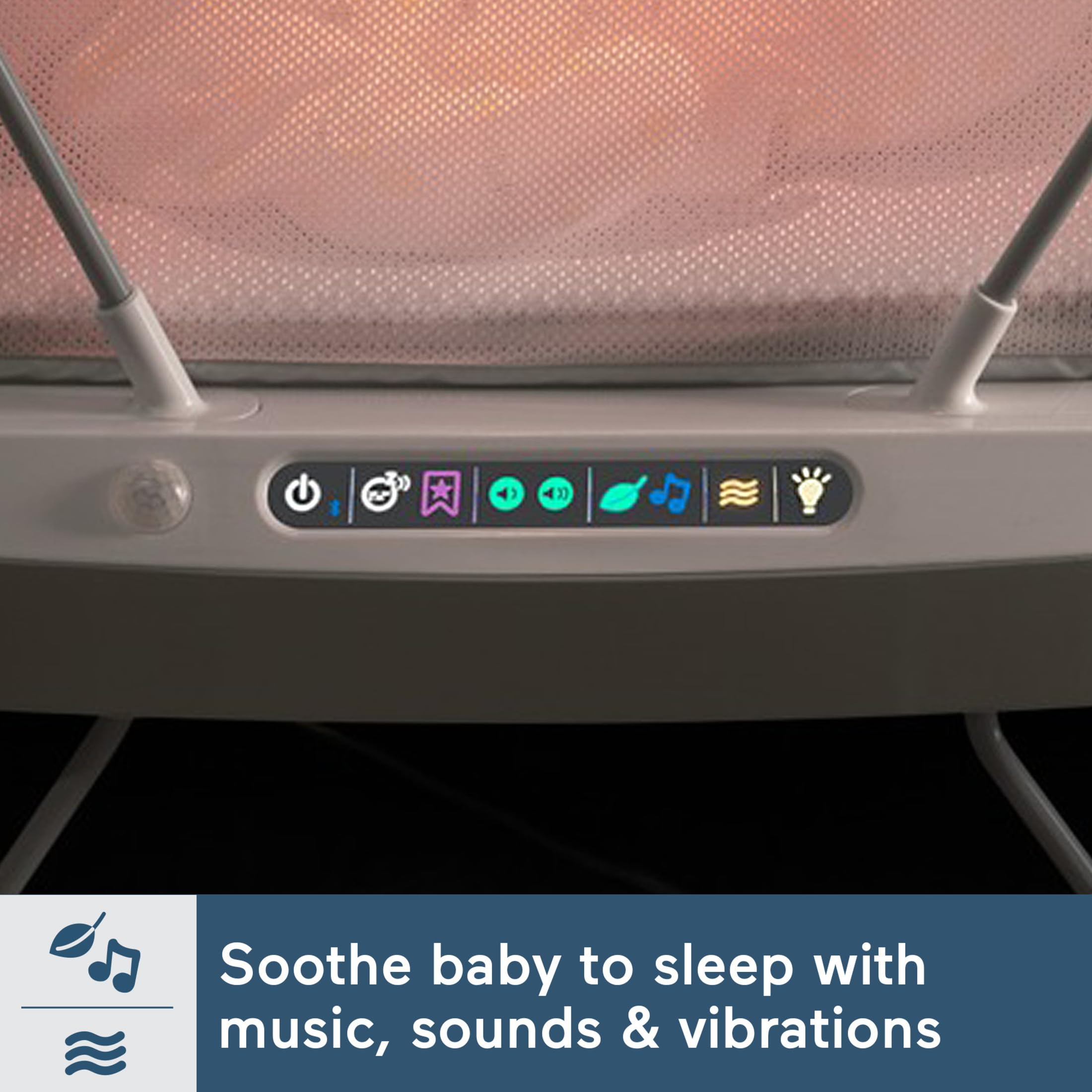 Stationary bedside bassinet with built-in sound detection and customizable lights, music, white noise and vibrations controllable from a smart device with the free Smart Connect app