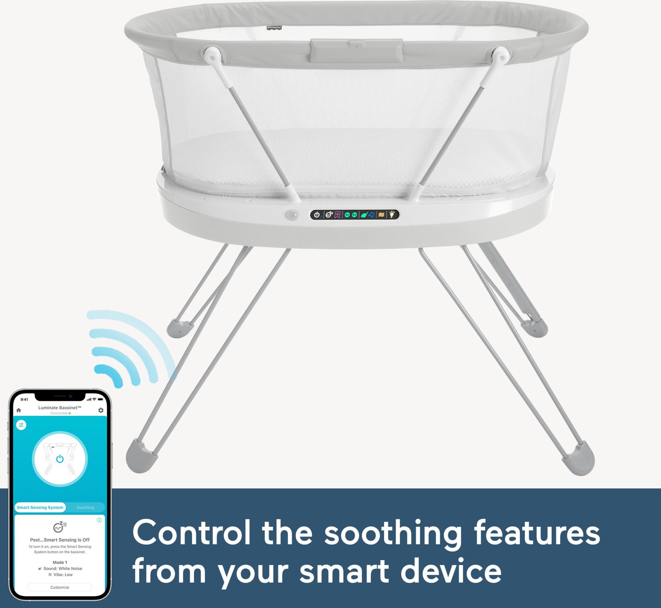 The Fisher-Price Luminate Bassinet is a customizable bedside crib that can help your newborn fall asleep with a variety of calming features you can control from your smart device. The built-in Smart Sensing System can detect your baby's cries and respond with music and vibrations to help soothe them back to sleep. This baby bassinet also features a crib light and motion-activated floor light to illuminate your path for nighttime check-ins, plus breezy mesh sides. (Max. weight 20 lb/9 kg) Use only with a child who is unable to push up on hands and knees, pull up or sit unassisted.