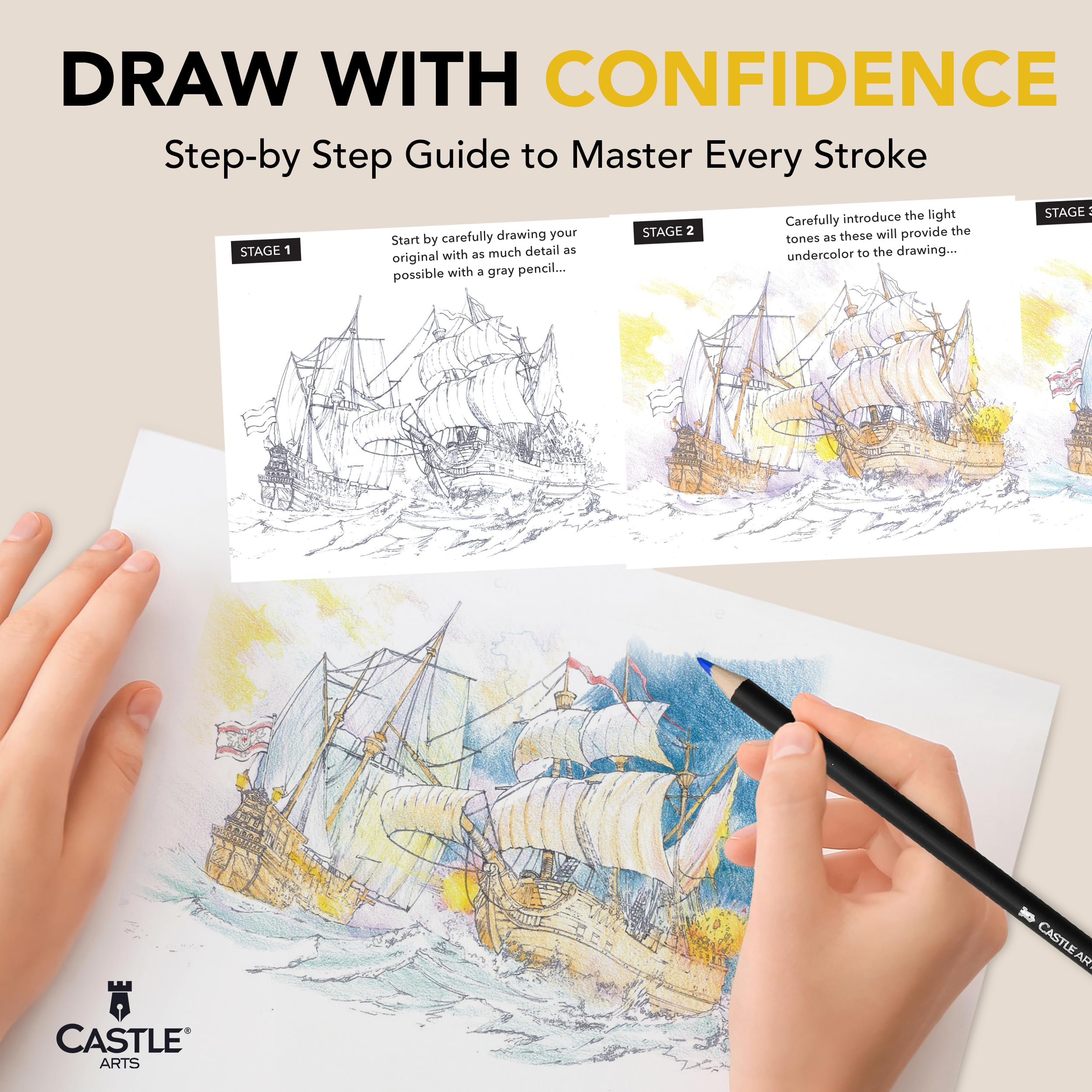 BUILD YOUR SKILLS Unique fold-out tutorial enables you refine your colored pencil skills by re-creating the stunning galleon illustration on the sleeve cover.