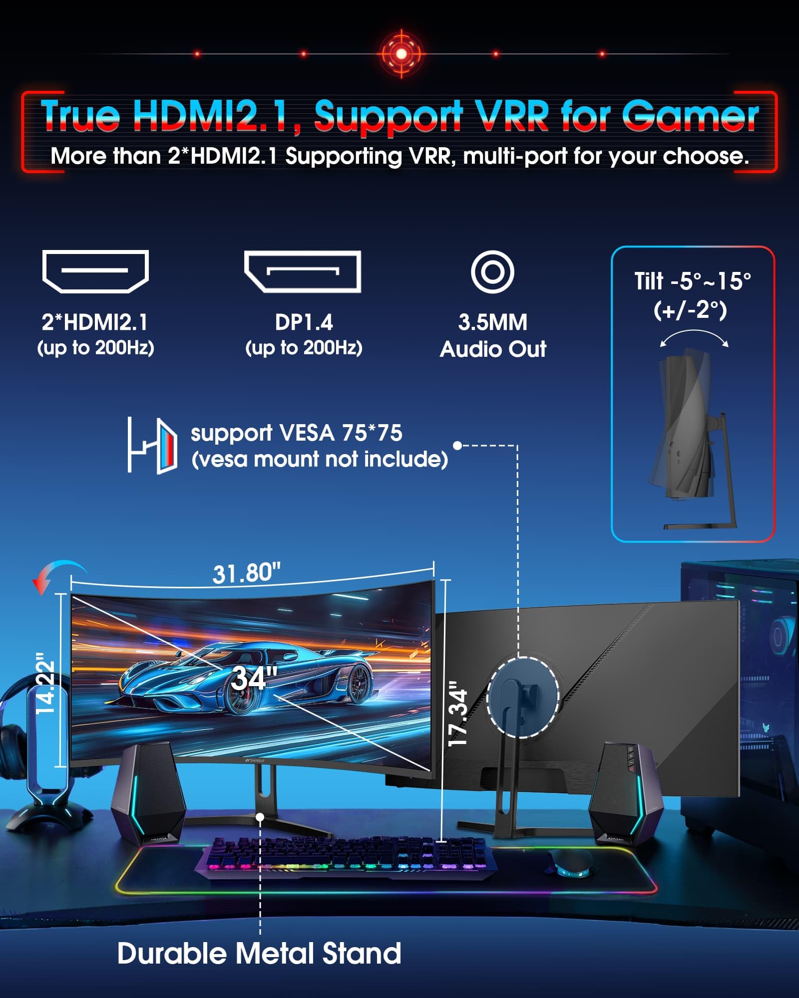 Others: Tilt -5°~15°(+/-2°) | Durable Metal Stand. SANSUI 34 In 200Hz Curved gaming computer monitor supports money-back and free replacement warranty from order date within 30 days and lifetime technical support.
