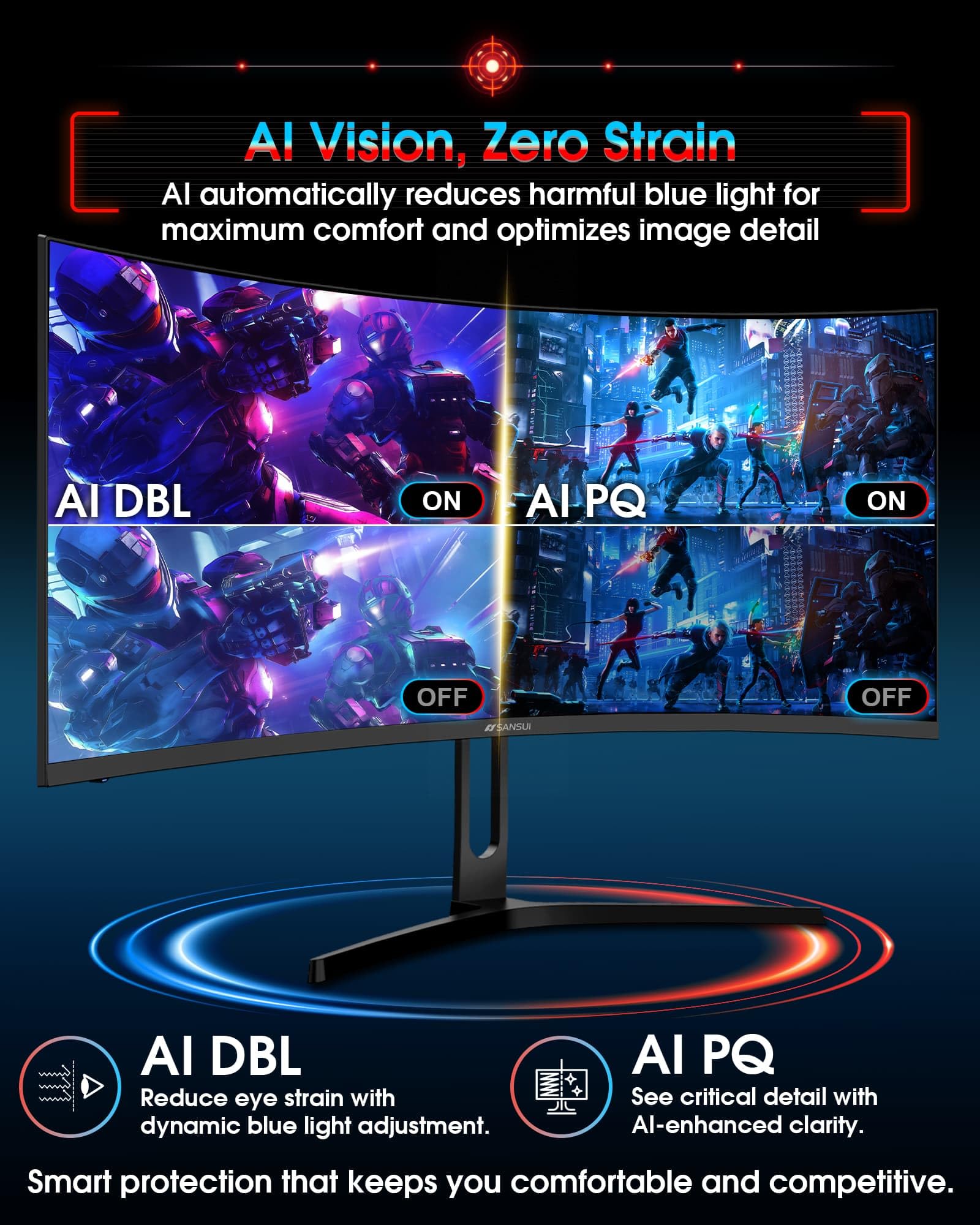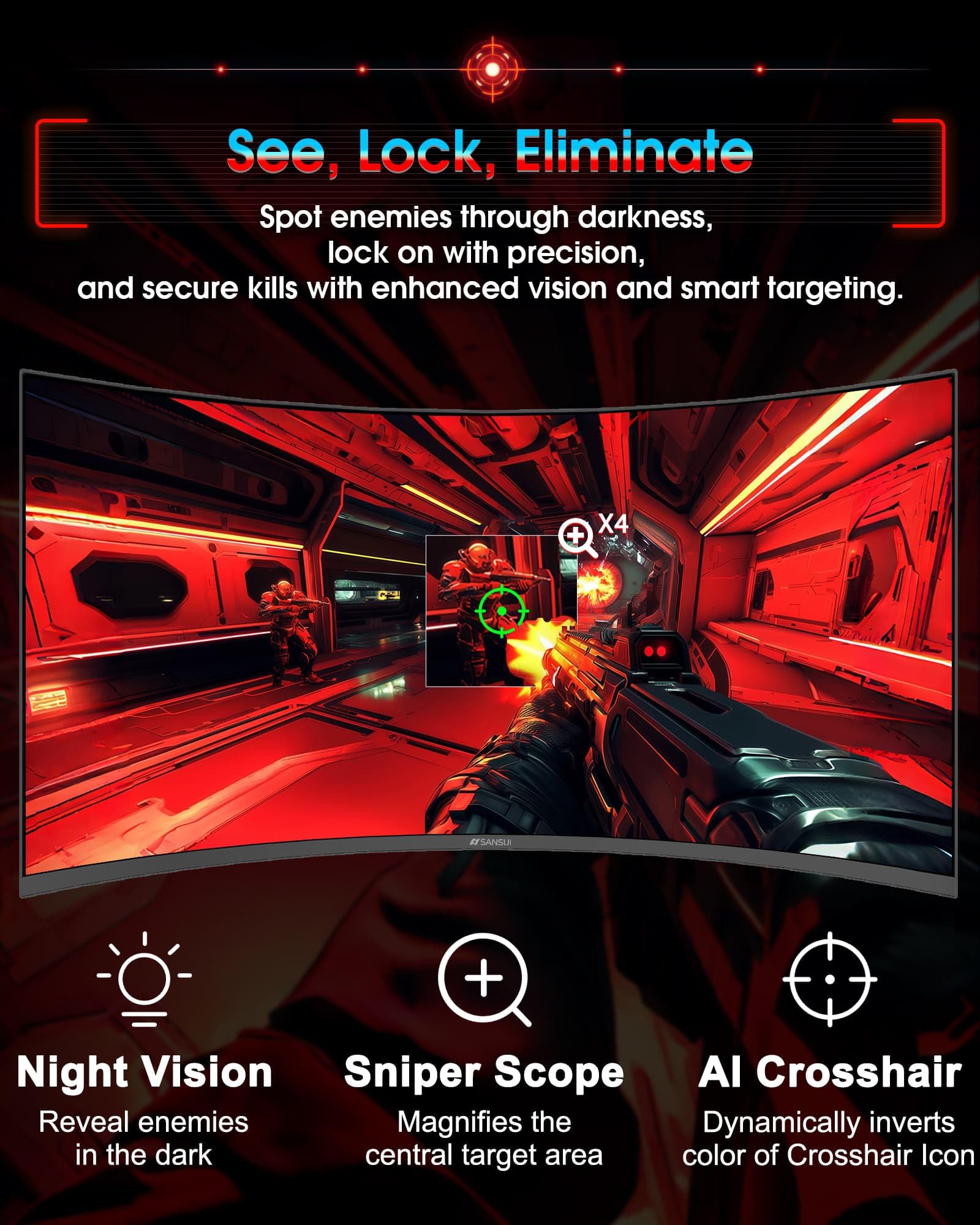 Optimized Performance: Up to 200Hz Refresh Rate | HDMI 2.1FRL (Support VRR) | Fast VA panel | AI Blue light reduction | AI Crosshair | AI PQ(Picture quality) | Sniper Scope.