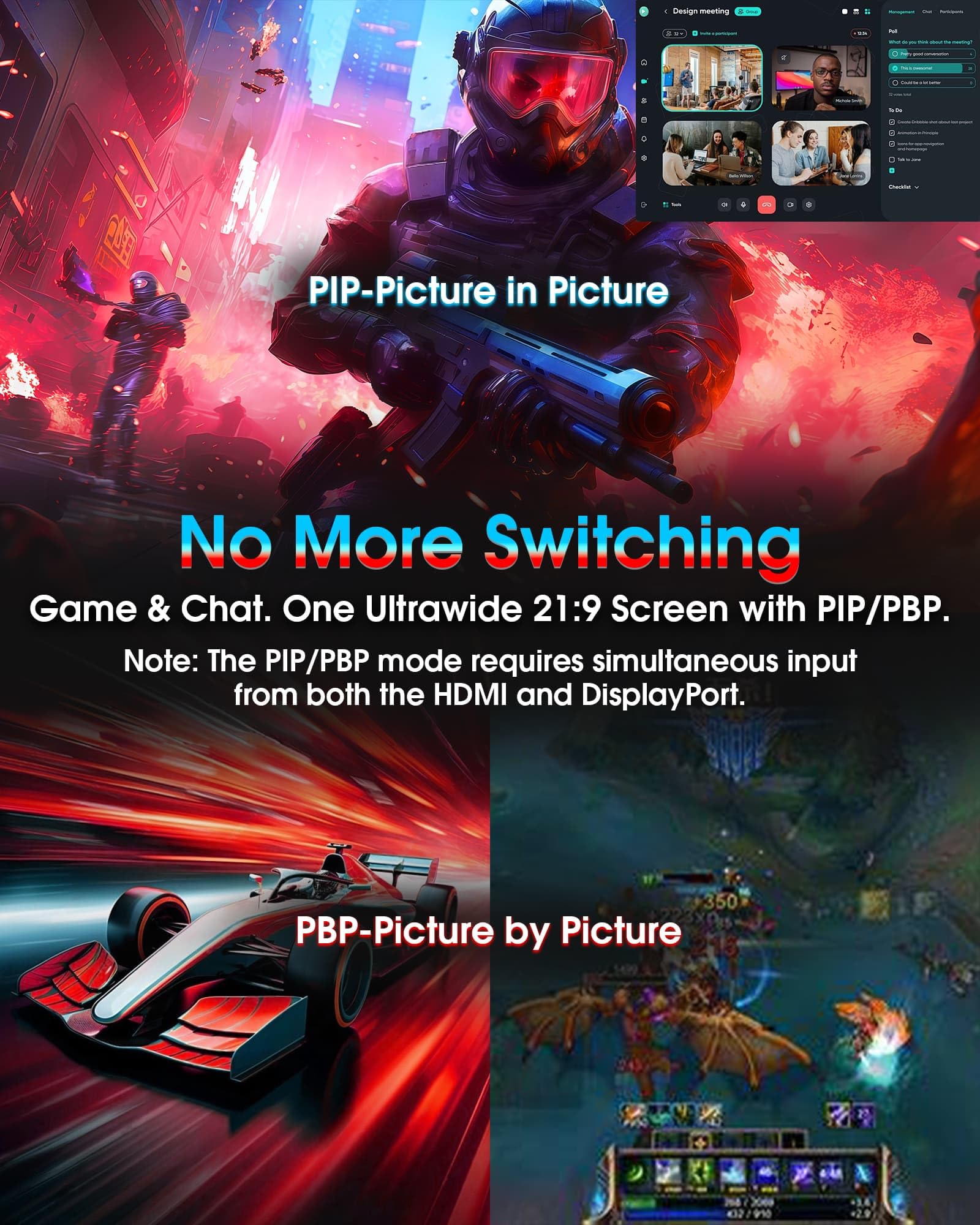 Note: The PIP/PBP mode requires simultaneous input from both the HDMI and DisplayPort.