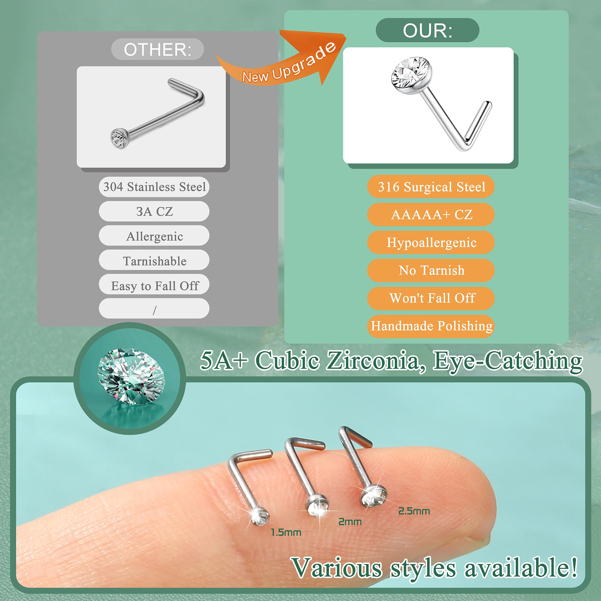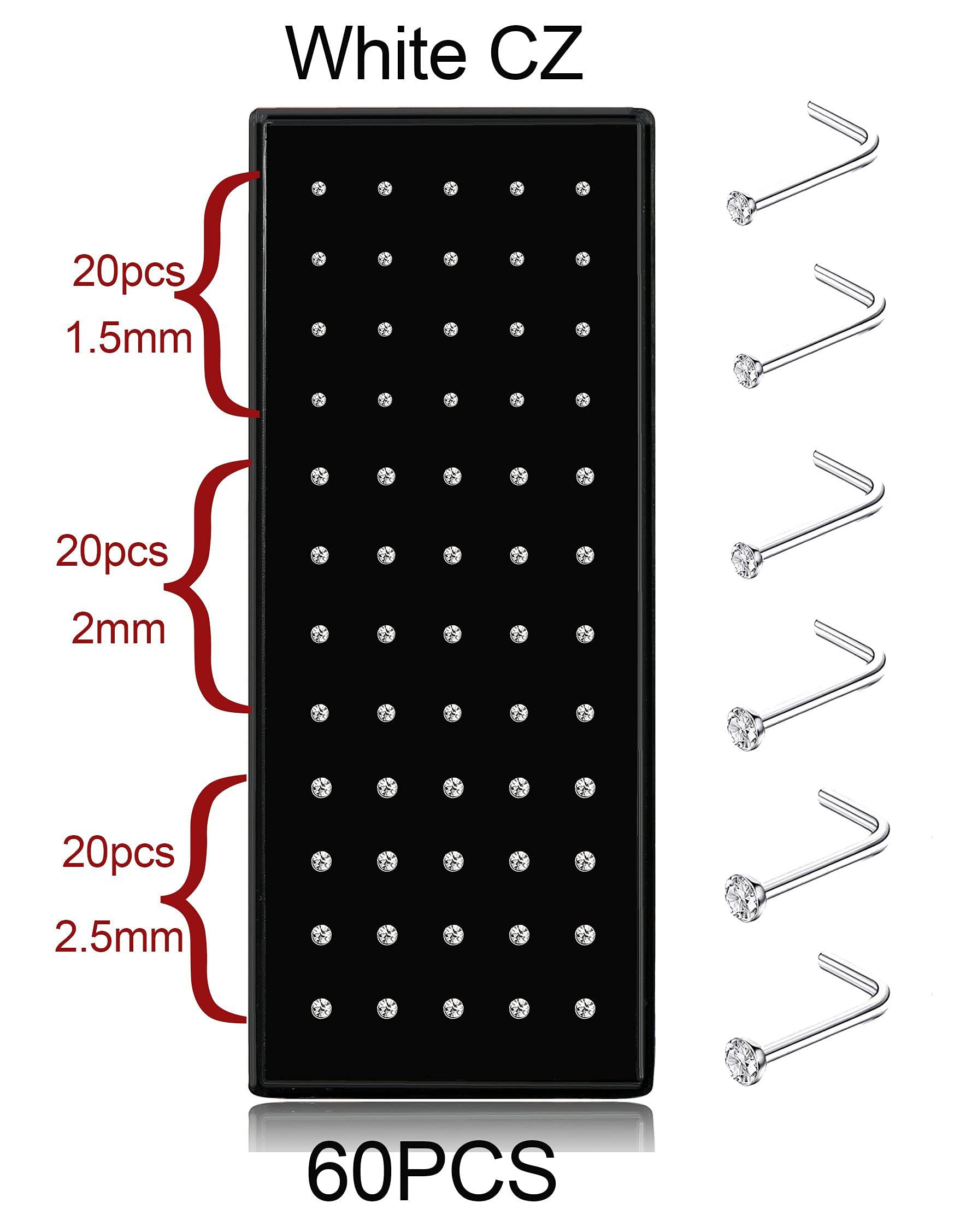 Assorted Collection: Including three sizes nose stud rings: 20pcs 1.5mm, 20pcs 2mm, 20pcs 2.5mm, Gauge: 22G = 0.6mm, 7mm wearable length, crystal studs; Perfect as daily jewelry