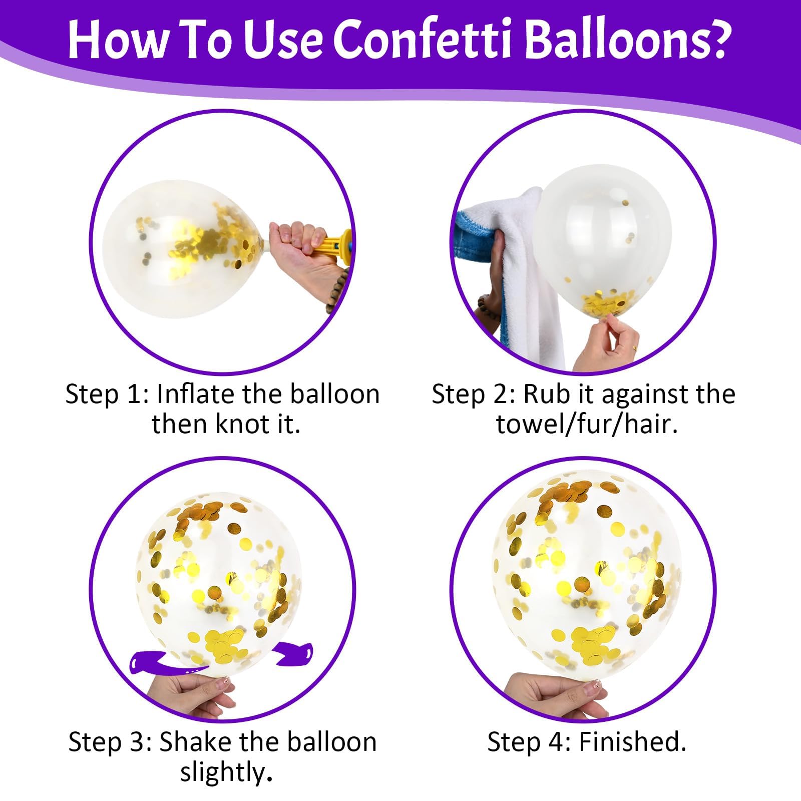 Easy To Use - Whether you're a professional party planner or just preparing for a casual get-together, the purple gold confetti balloons are straightforward to use. Simply use a hand pump, an electric pump, or even blow up balloons for a birthday party yourself, the latex balloons quickly take shape with minimal effort. Rub and shake the purple balloons thoroughly after inflation, also just inflate to 85-90% to avoid explosion.