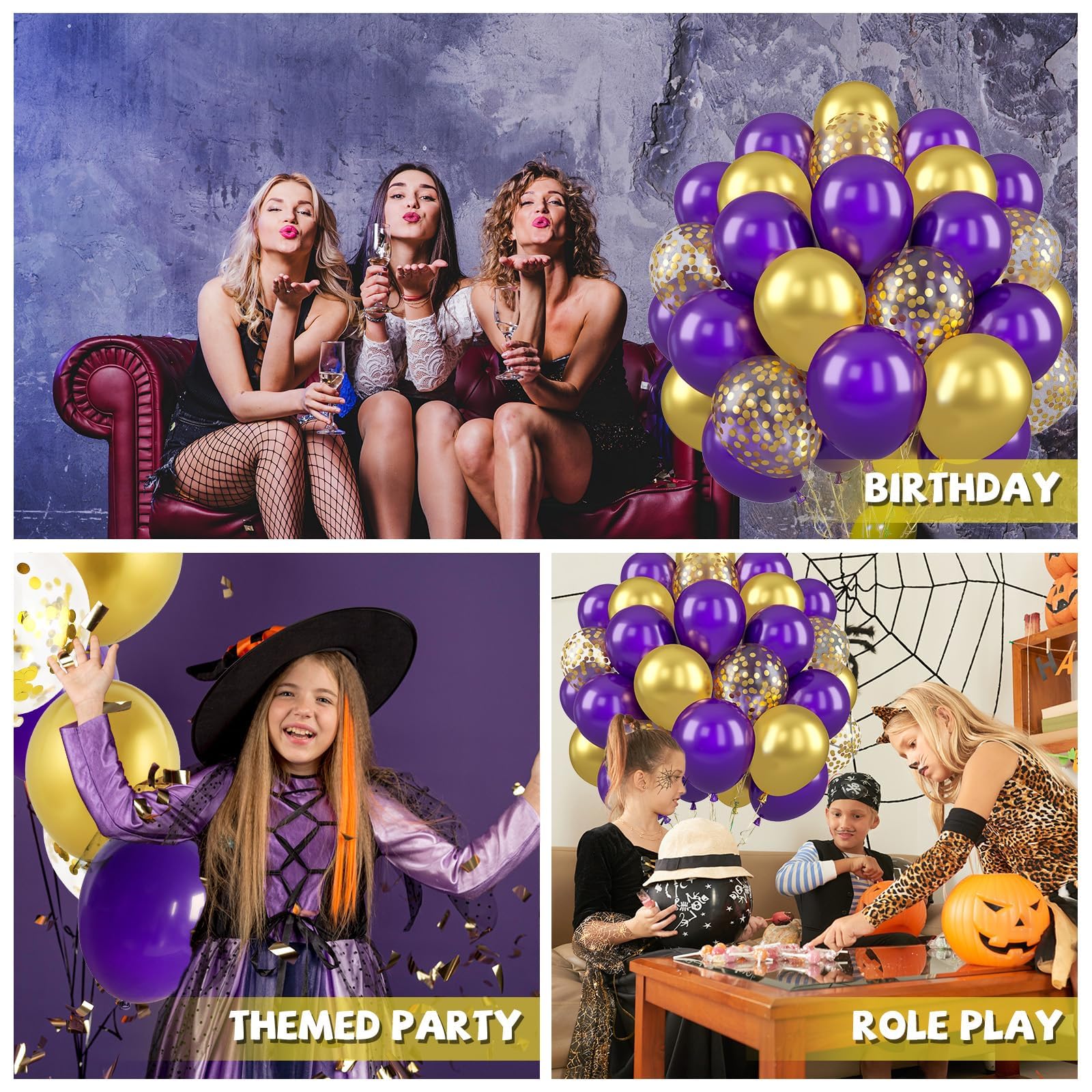 What You Get - The purple gold balloons include 50 balloons, 3 distinct colors: dark purple balloons x 36, metallic gold balloons x 8, confetti gold balloons x 6. Accompanying by a 10m ribbon. These striking and captivating hues will beautifully enhance your memorable and enjoyable moments!