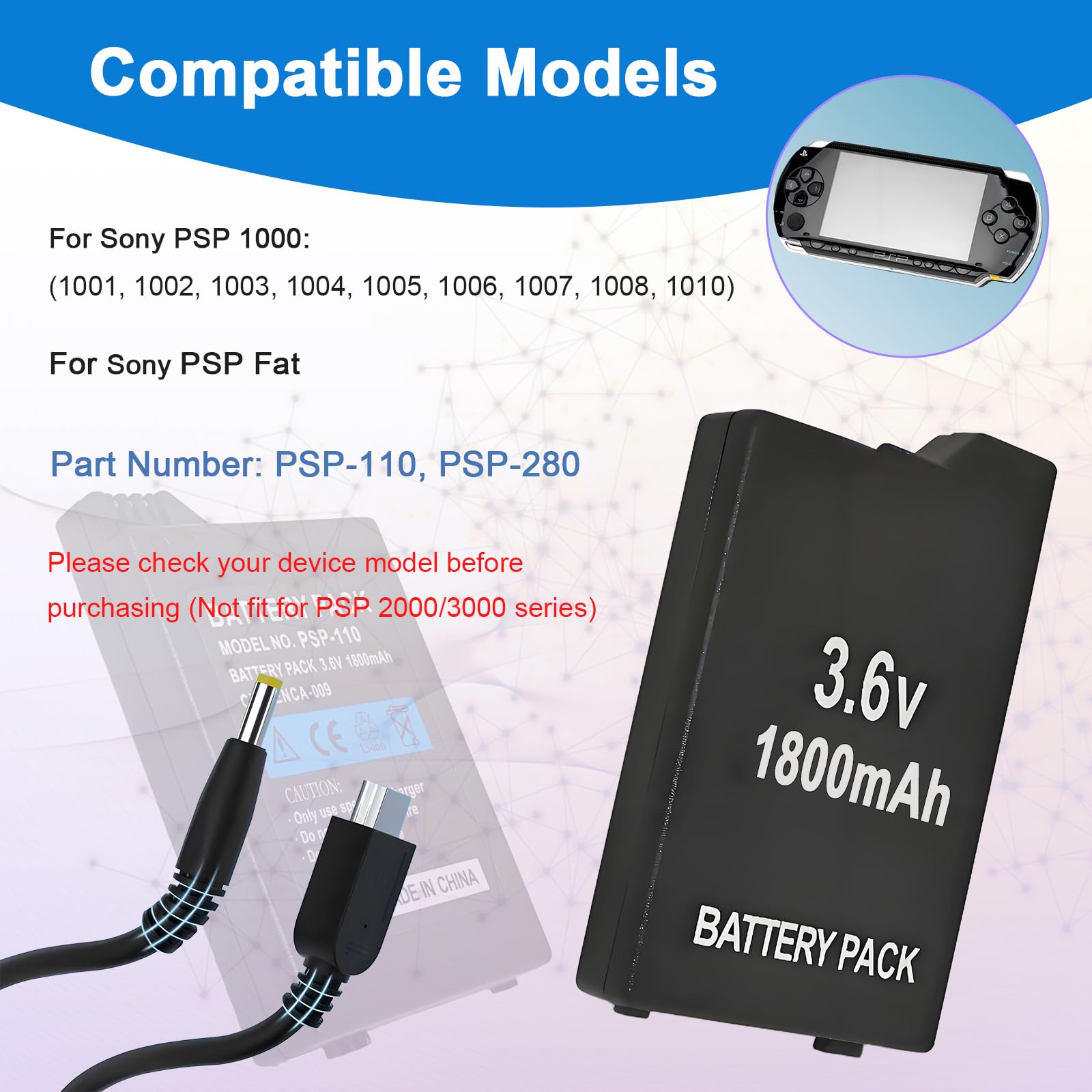 For PSP 110 Battery: Compatible with Sony PSP 1000 series, PSP Fat game player battery