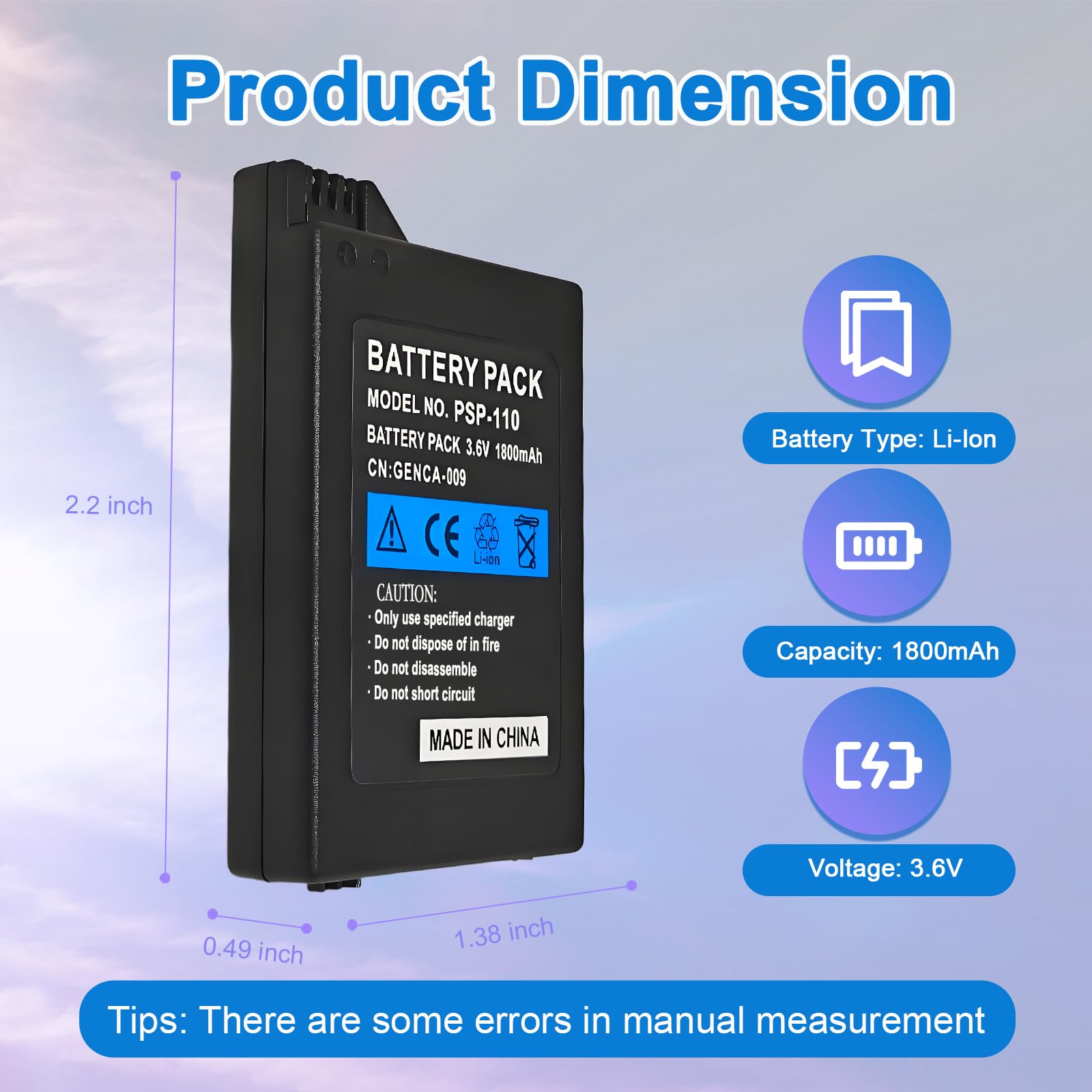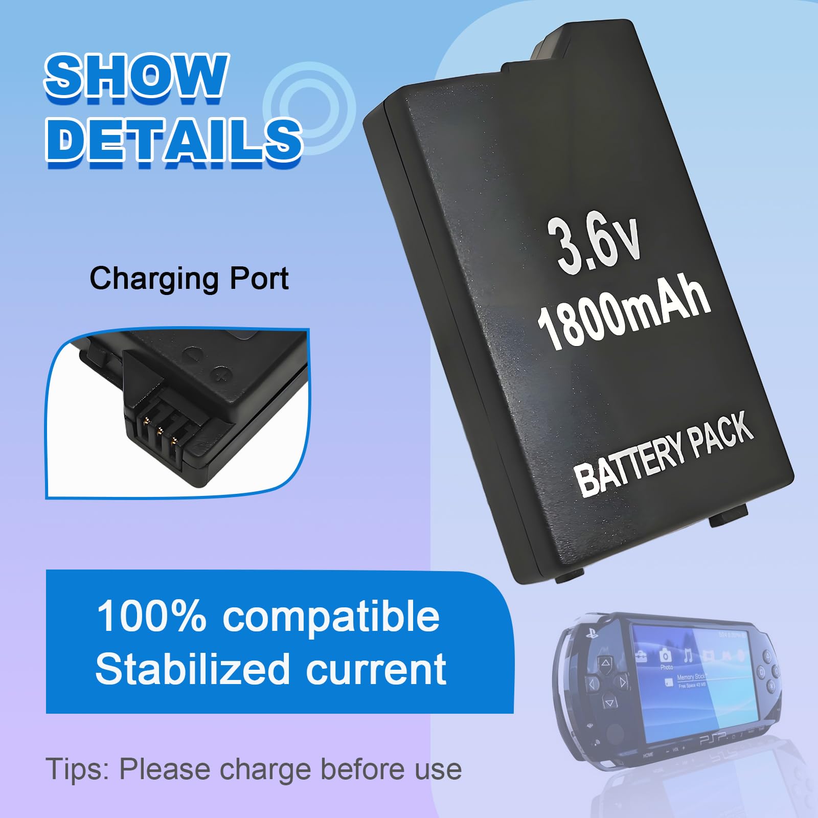 Safe to Use: The rechargeable battery for PSP-1001 has a built-in microchip to prevent overcharging, over-discharging, short-circuiting, overheating, etc., to ensure the safety of the battery