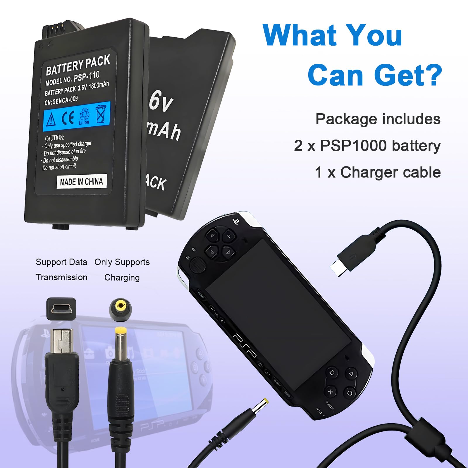 Easy to install: Package includes 2 × PSP-1000 battery + 1 × USB Charging Cable. Tips: The first three cycles of use require complete charging and discharging to improve battery life