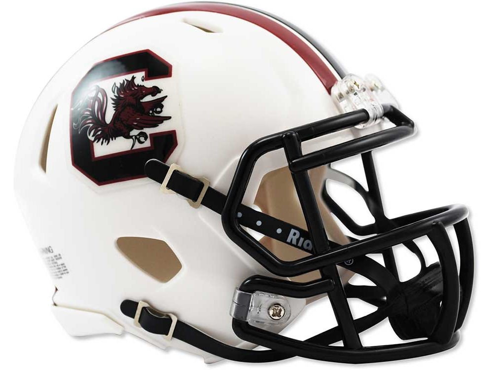 Based on one of the most popular on-field designs, this collectible Speed Mini football helmet is made specifically for fans of the South Carolina Gamecocks. At approx. 5.5 in. tall, this half-scale display helmet is perfect for all football fans and great for autographs. The helmet features a mini size Speed shell, the S2BD-SW-SP face mask, a 4-point chinstrap, and official paint and decals. The perfect collectible or gift!