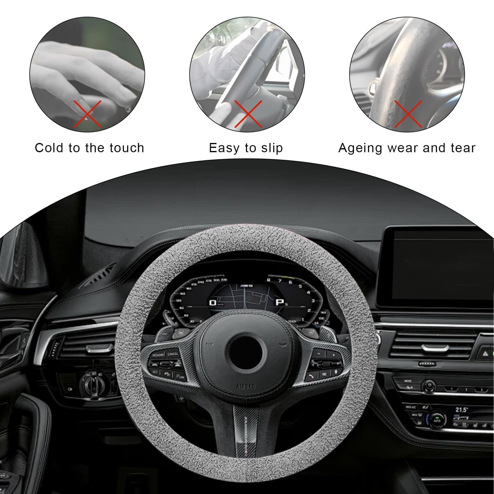 【Soft & Comfortable】: The plush fleece is very soft to the touch and gives you a very comfortable texture. Especially in winter, when you grasp the furry steering wheel, it can give you a warm feeling, making the journey more enjoyable to bring a pleasant driving experience.