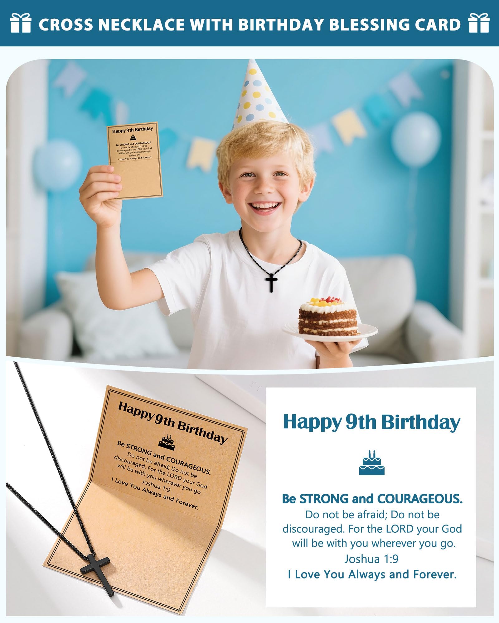 HAPPY BIRTHDAY CROSS NECKLACE: Celebrate the boy's birthday with a heartfelt Christian present. This black cross necklace carries a powerful blessing of courage, strength, and God's love