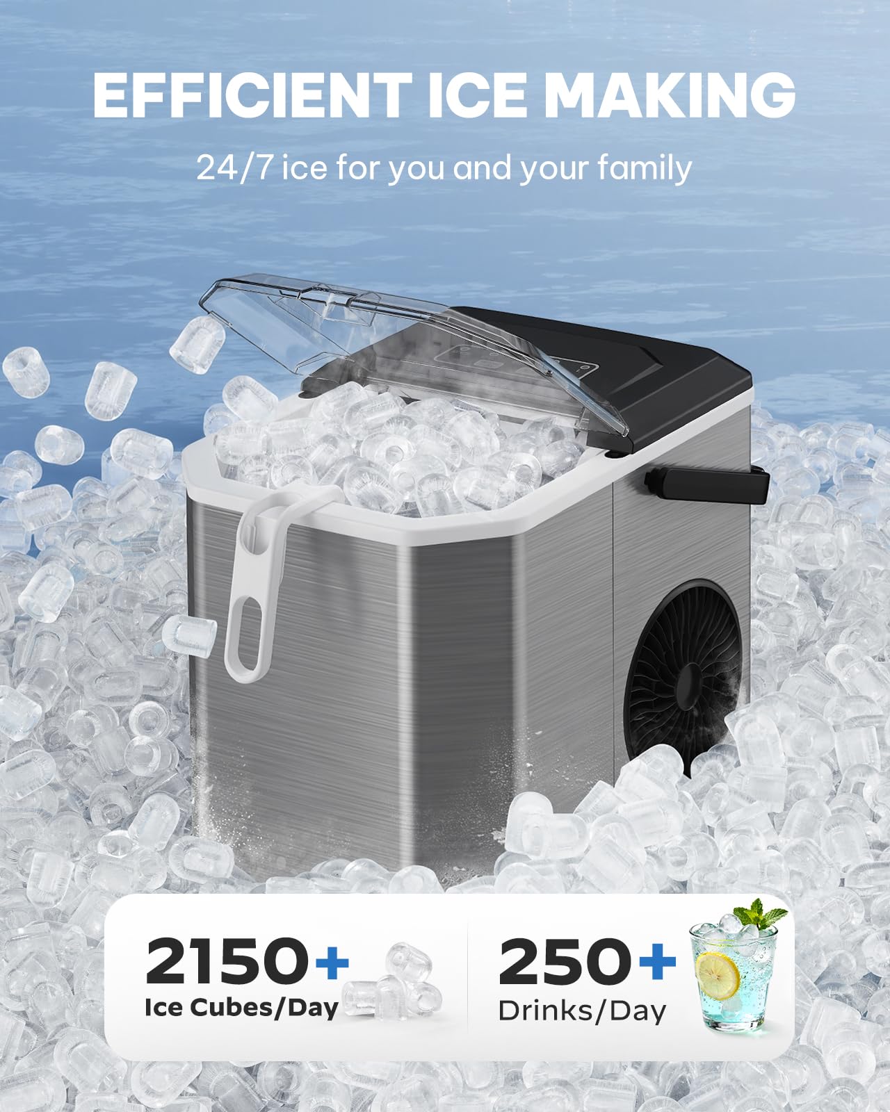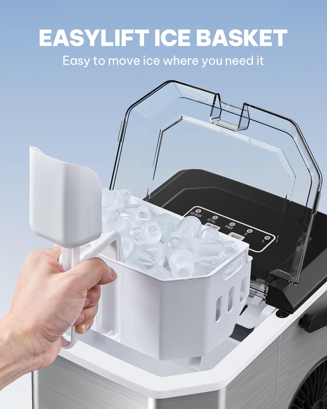 CONVENIENT PORTABLE DESIGN: The sturdy handle makes the ice maker easy to carry, while the scoop attaches to the basket for convenient storage. Weighing just 13.7 lbs, you can take this compact machine room to room or to an event with ease.