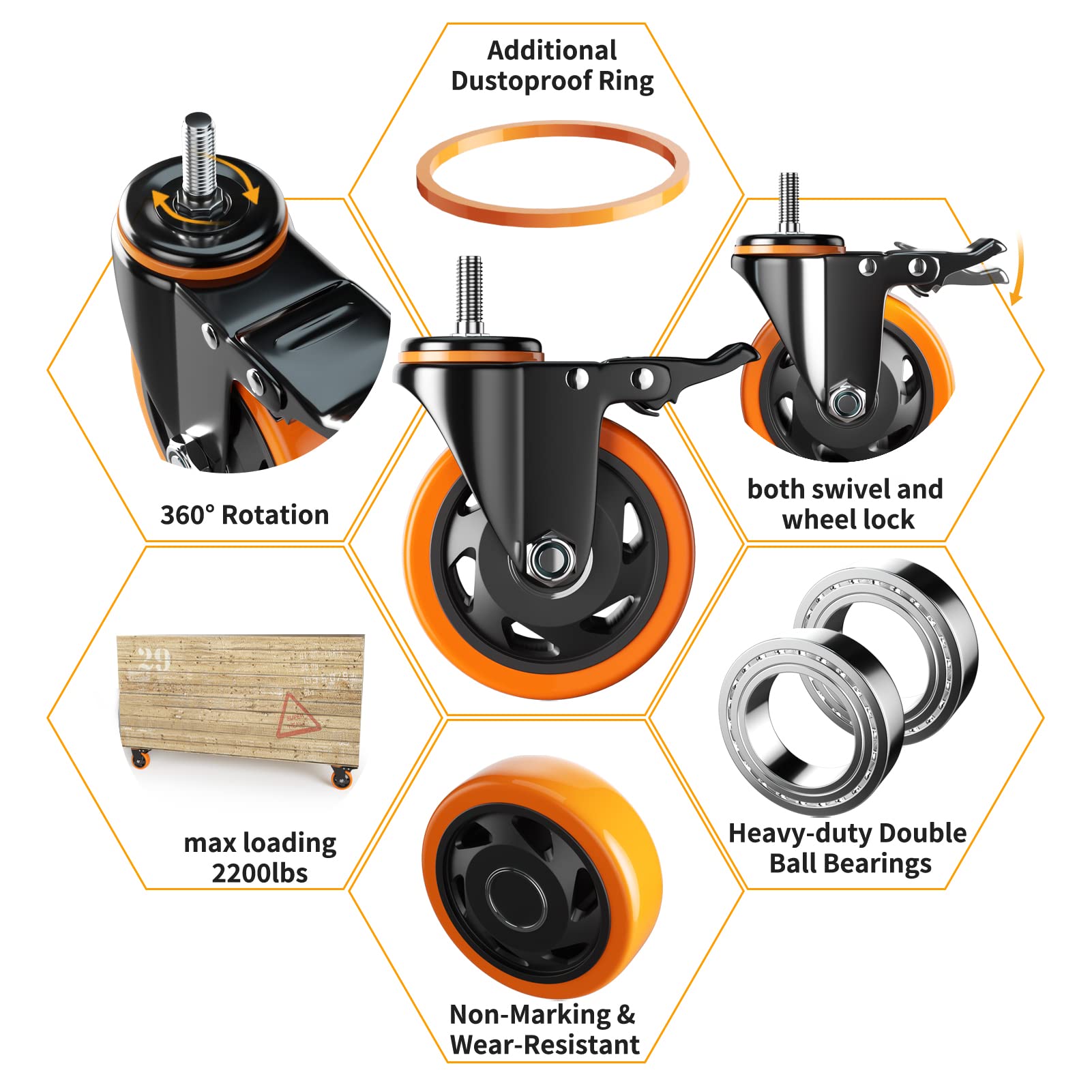 SAFETY DUAL LOCKING SYSTEM: Double lock mechanism locks both the heavy duty wheel and the swivel bearing at the same time, which is holding the equipment firmly in place to reduce accidents, essential for safety. While releasing the brake, the heavy duty casters become 360-degree swivel, can respond immediately to changes in desired direction.