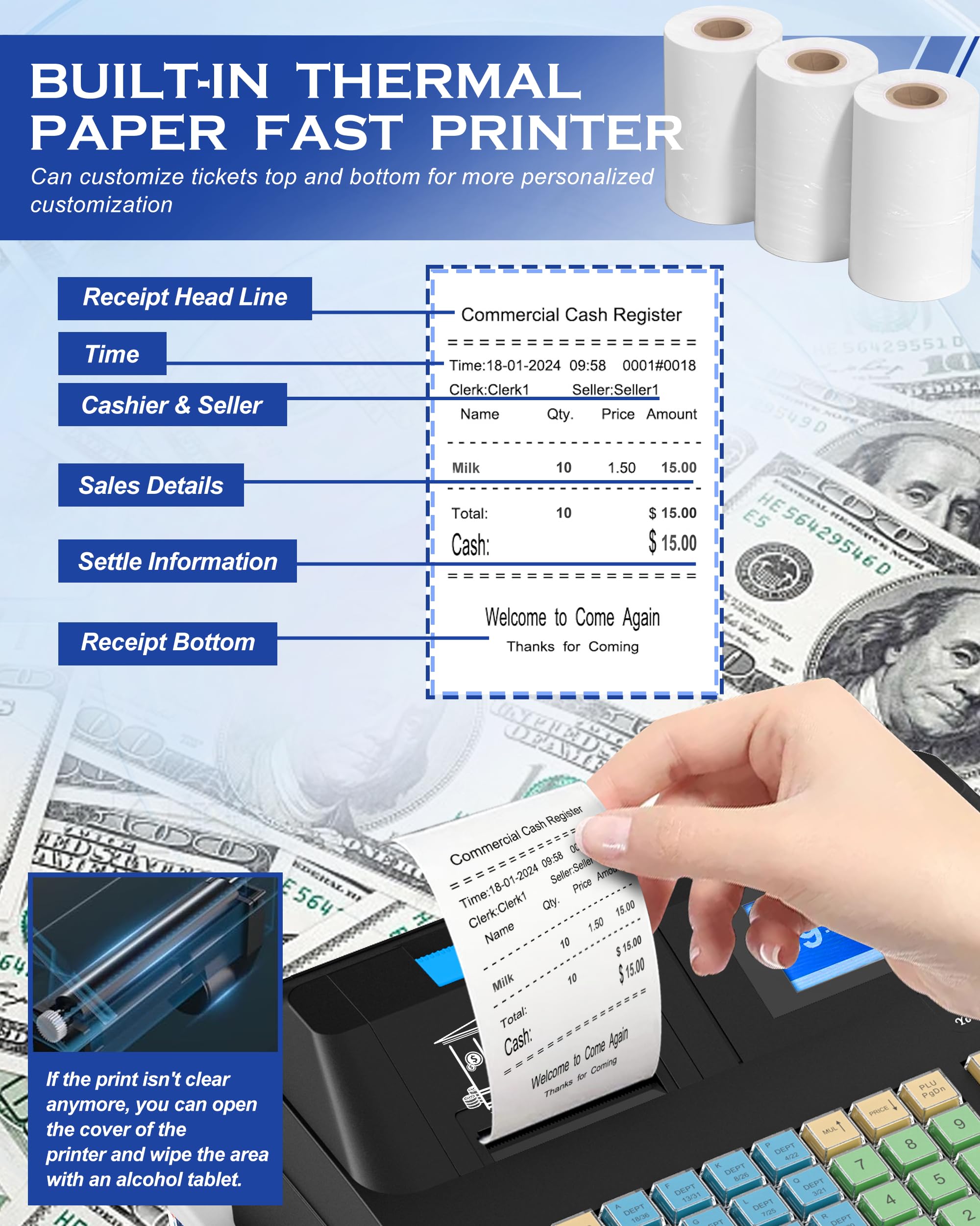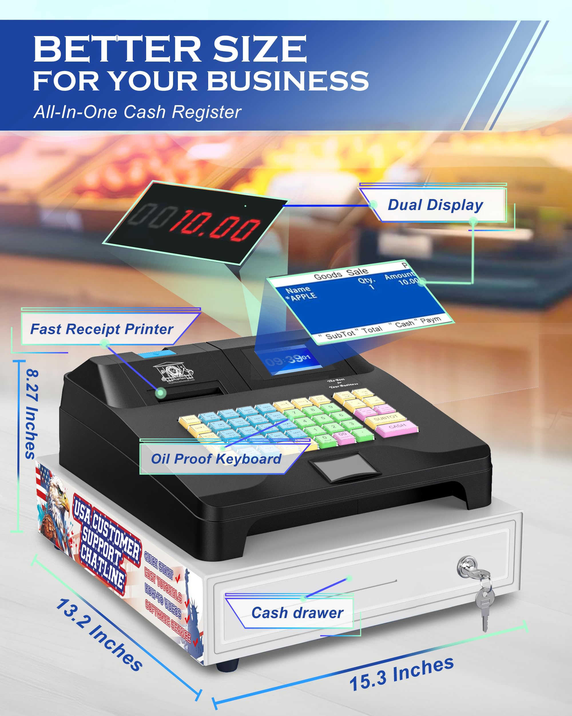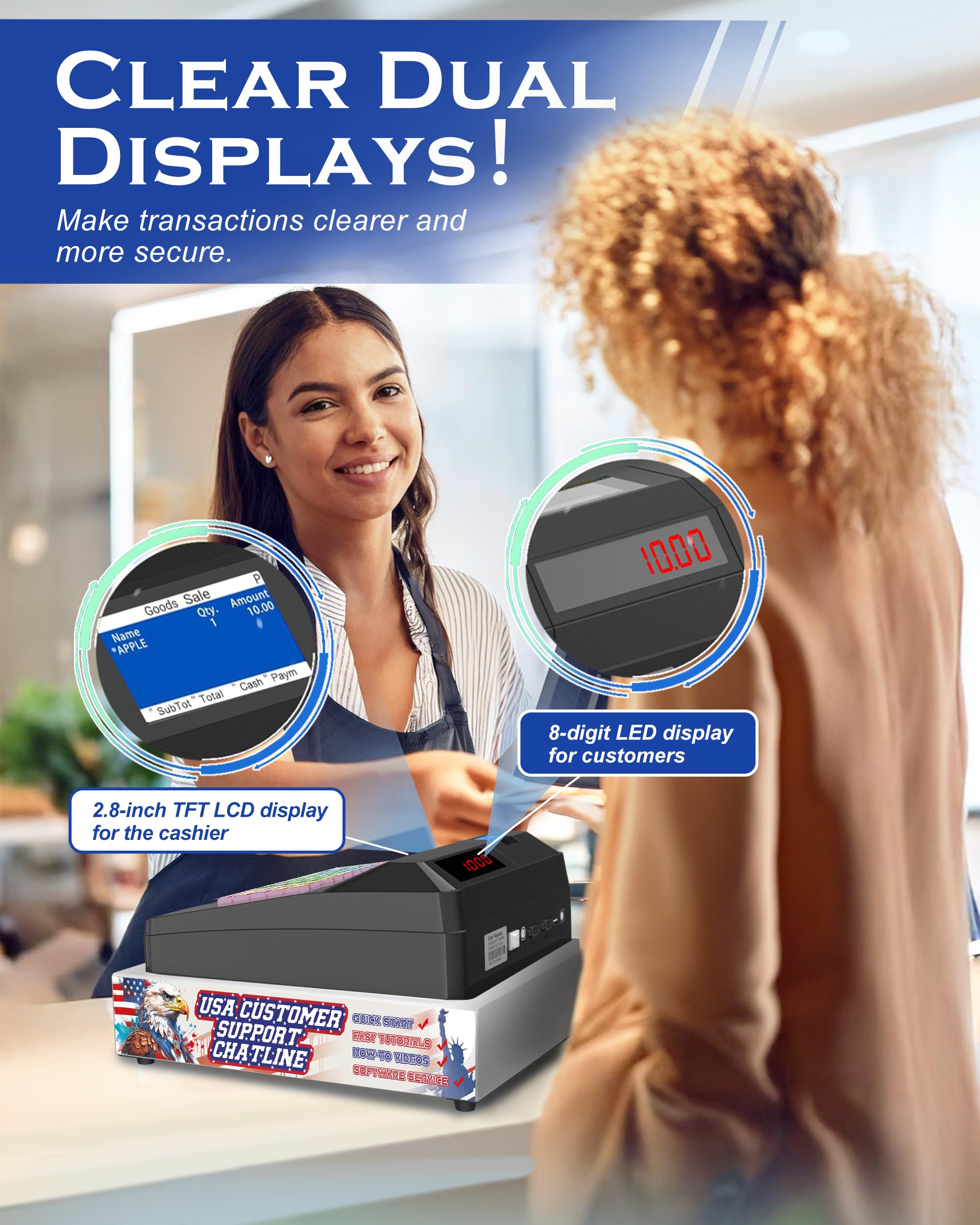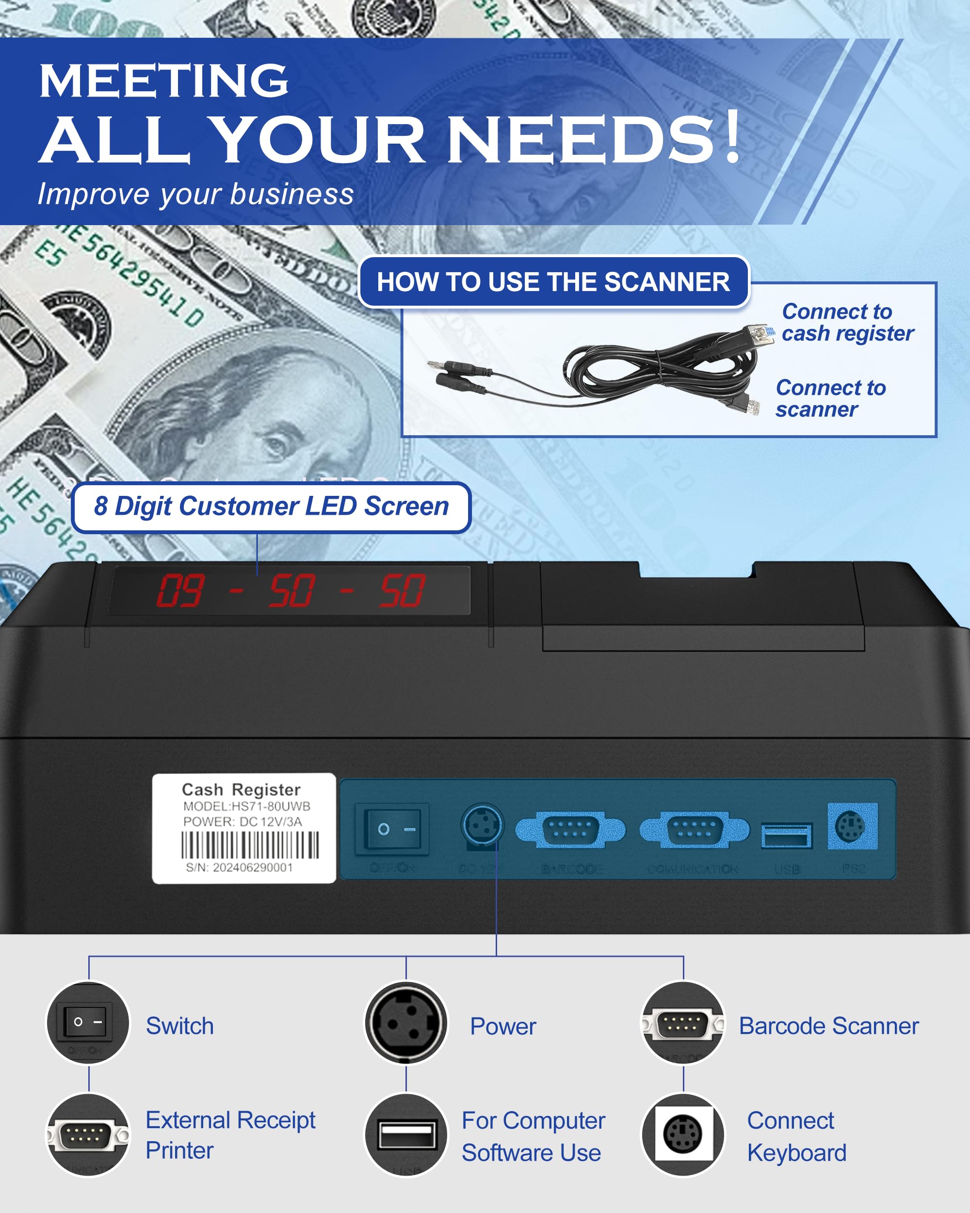 POWERFUL FUNCTIONS:The built-in thermal printer has a smoothly print speed of up to 90mm/s, reducing customer wait times. It features a 2.8-inch TFT LCD for the cashier and an 8-digit LED display for customers. The integrated cash drawer pops open during transactions. Also supports multiple device connections,it's equipped with 2 RS232 ports for connecting scanners, scales, and printers; a USB port for connecting to a computer; and a PS2 port for keyboard connection.