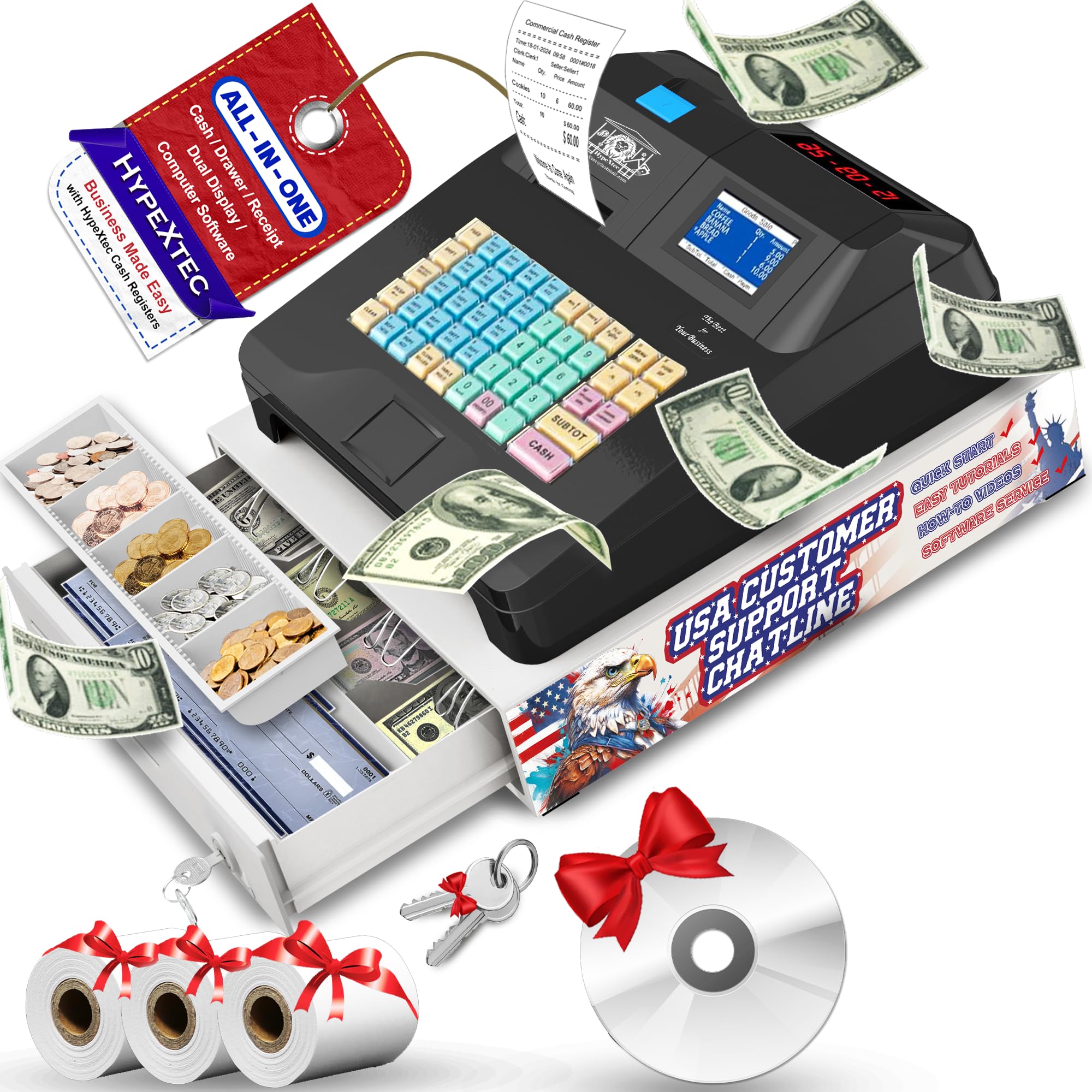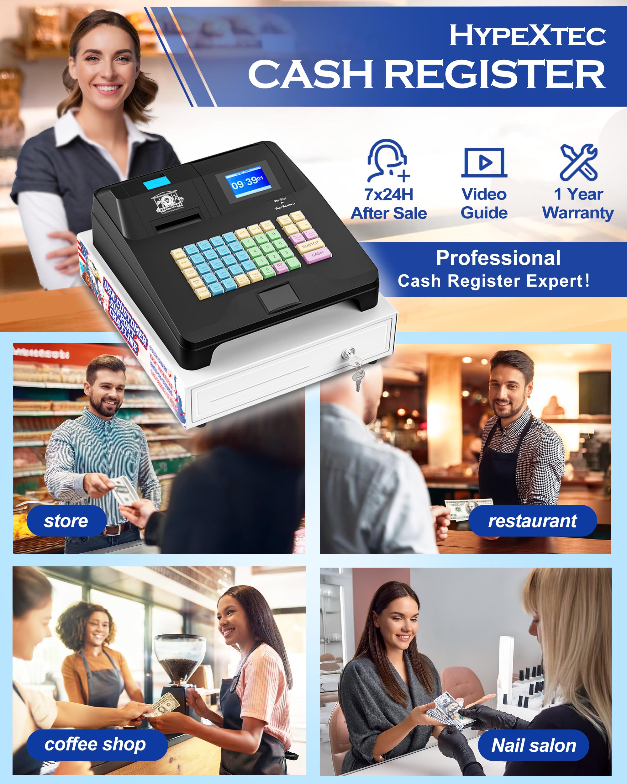WORRY-FREE SERVICE: HypeXtec cash register has passed both RoHS and FCC certifications. Package includes the cash register, 3 rolls thermal paper, USB cable, power cord, 2 cash drawer keys and user manual. Ideal for small supermarkets, convenience stores, and restaurants. We offer 24/7 professional one-on-one technical support(Email, phone or video). Please reach out to us if you encounter any issues.