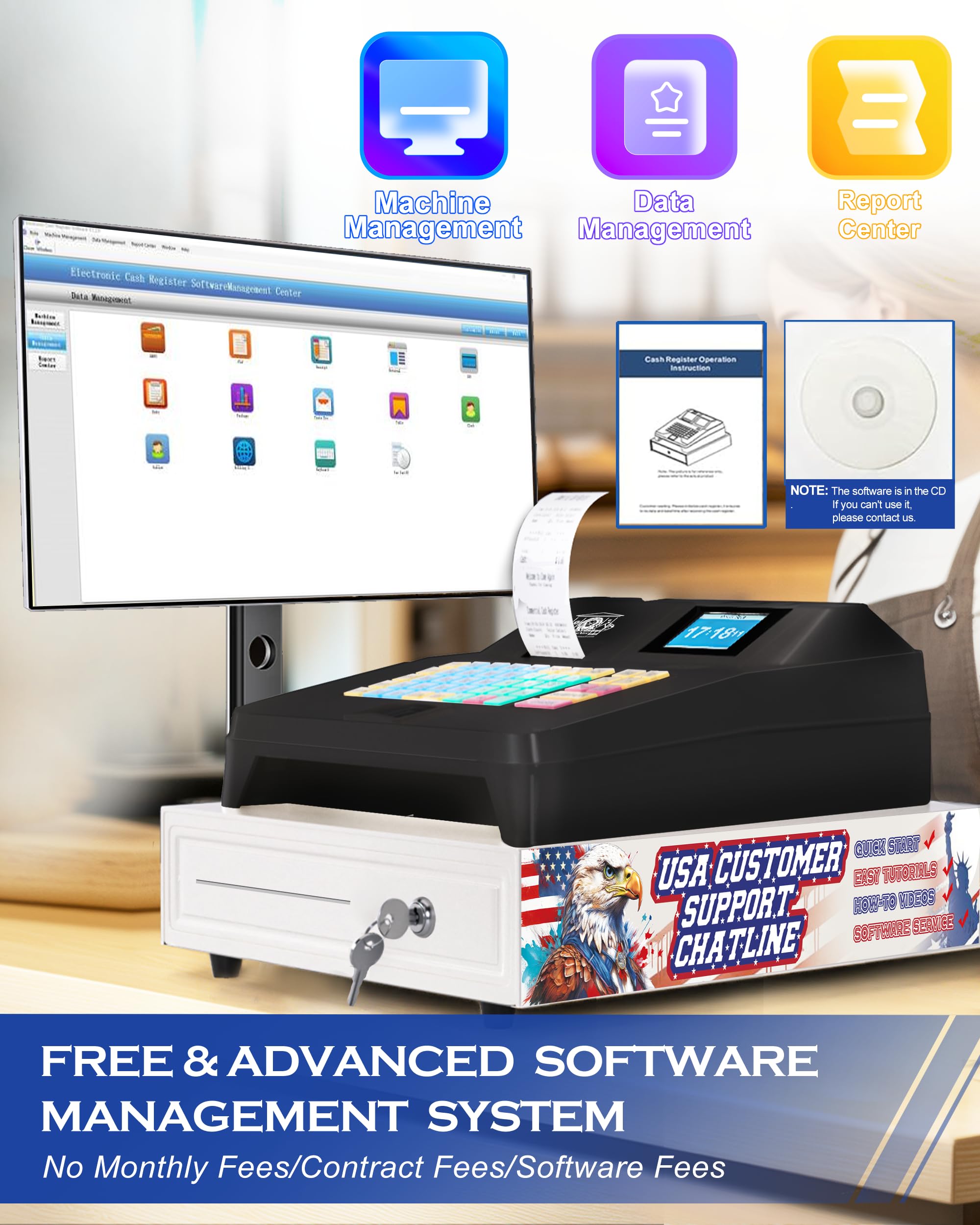 Comprehensive Report&Software Management System:In sales mode, it allows for one-click checkout after item recognition. It also provides sales data reports per hour, per cashier, per item, per department, refunds, cash drawer openings, and more(Print to get the report). HypeXtec cash register also has it's Self-developed Advanced Software Management System (without Monthly Fees/Contract Fees/Software Fees) which supports connected software to manage goods, receipts and other information entry.