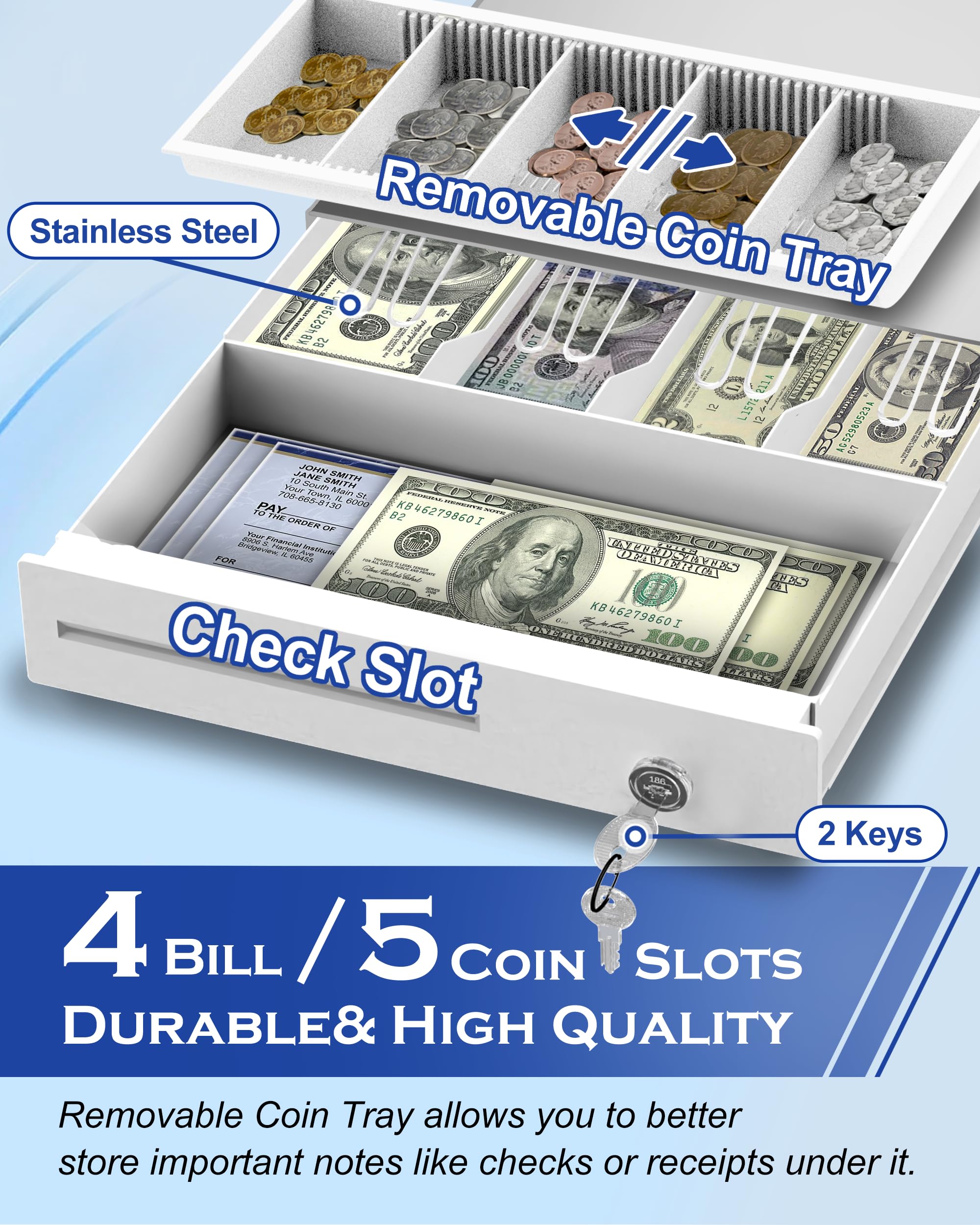 SECURE HUMANIZED DESIGN: Supports up to 50 cashiers with individual passwords and comes with 2 cash drawer keys for dual security. The cash drawer has 4 bill compartments and 5 removable coin compartments, Larger capacity to keeping everything organized. The ABS material casing is waterproof and oil-resistant, suitable for a variety of environments.