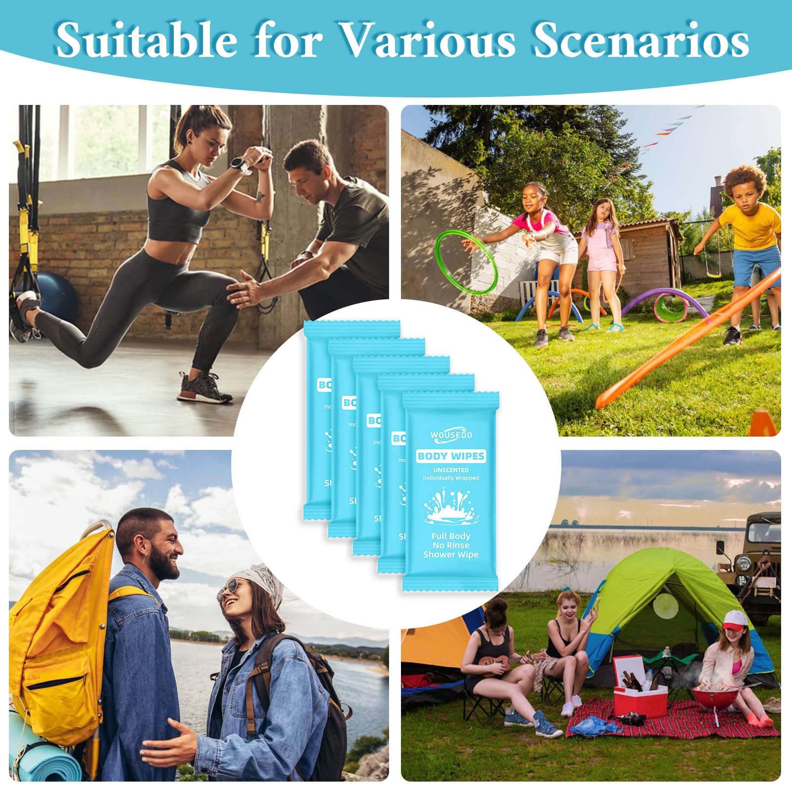 Wide Applications: Our body wipes are suitable for all age groups and can be applied in a variety of scenarios. Whether you are traveling, camping, exercising, or just need a quick refreshment during the day, our shower wipes are always handy. They are a convenient and efficient cleaning solution that fits your active lifestyle, suitable for home, office, gym and other outdoor settings.