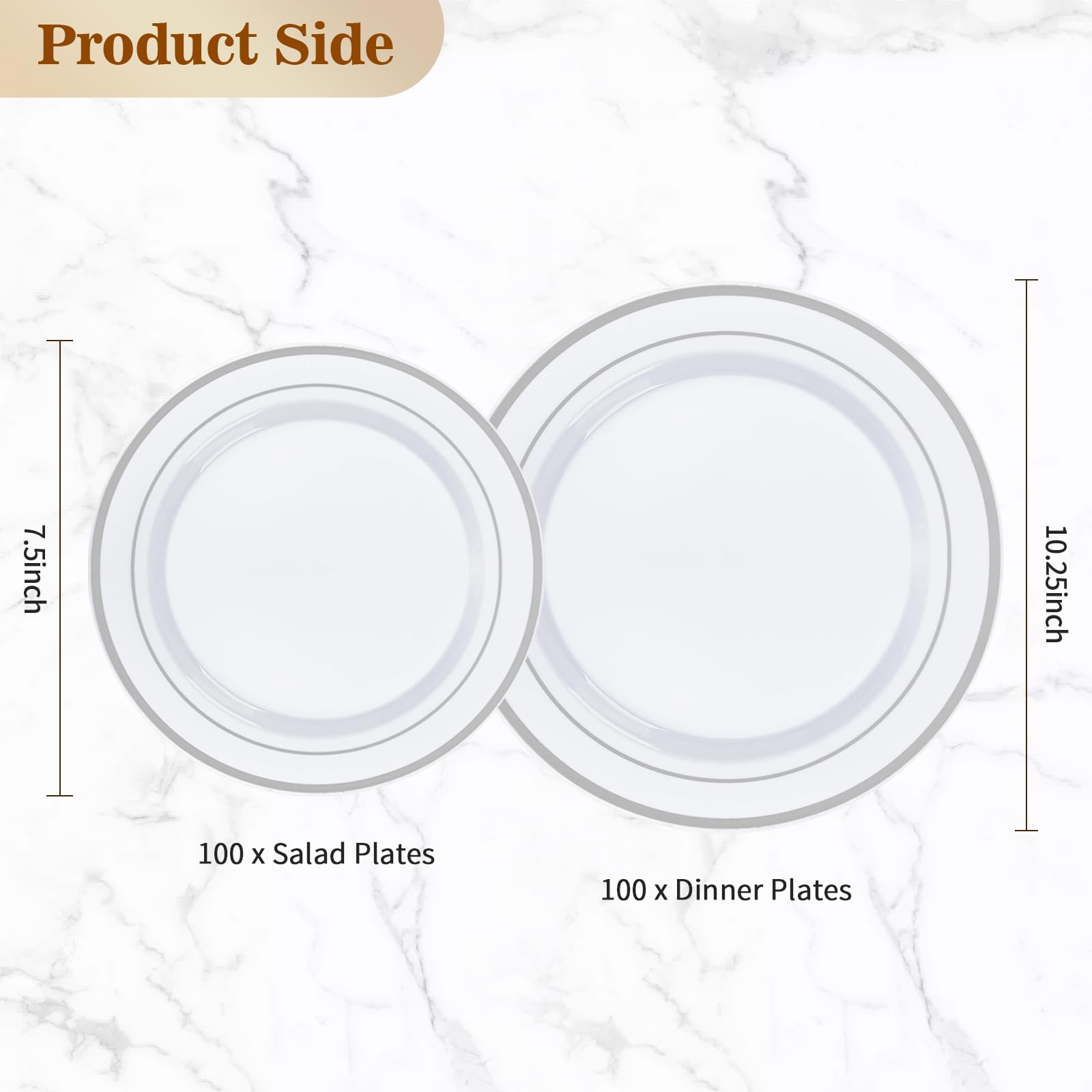 DIMENSION DECODED - Party plate sizes for every occasion. This set includes 100 dinner plates (10.25''), perfectly tailored for generous main courses and diverse meal elements. Complementing these, you'll find 100 smaller dessert plates (7.5''), ideal for presenting delectable desserts, cakes, and appetizers.