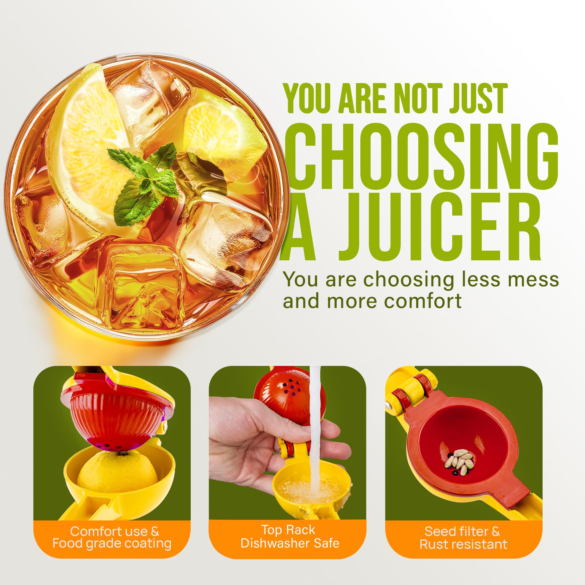 SQUEEZE OUT EVERY DROP OF JUICE: Our 2-in-1 lemon squeezer won’t waste a single drop from your favorite fruit! We have designed this lime juicer to be easy on hands. Watch limes, lemons, and small oranges beg for mercy, even with a soft squeeze. The holes at the bottom of the citrus juicer serve as a seed filter to prevent the pulp and seeds from getting in your way.