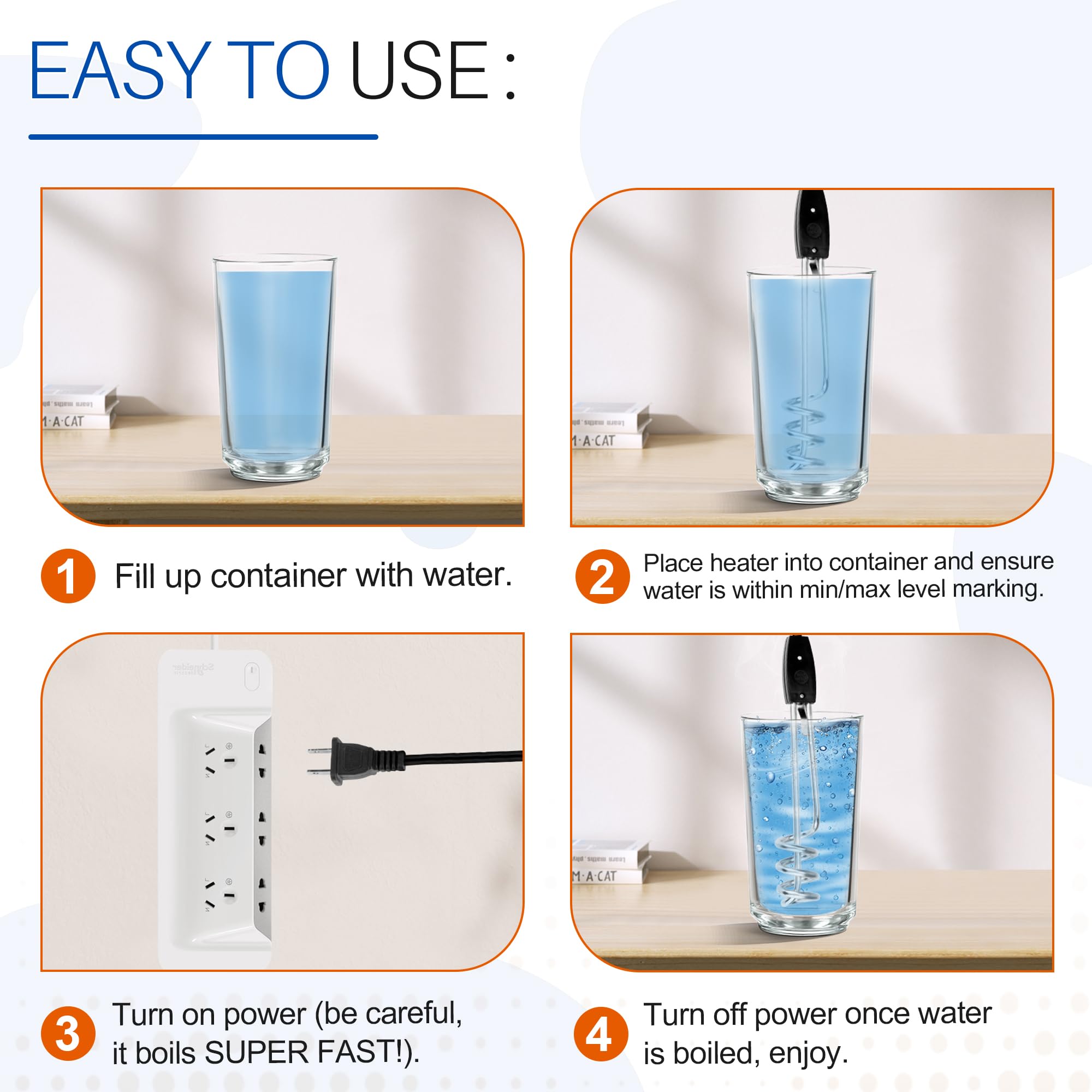 【Easy to Use】Our immersion heater is designed for simplicity and convenience. Simply portable water heater in water at the appropriate level, plug it in, it will start heating and use a thermometer to observe the water temperature, unplug the power, wait for a few seconds, and then remove it from the water