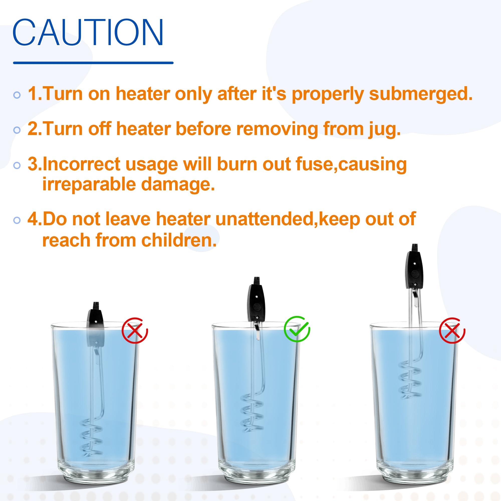 【Safety Precautions Warning!!!】Please ensure the heater is fully immersed in water to prevent dry heating and potential fire hazards. By following the provided instructions, which are designed to be user-friendly, you can avoid such risks. Never plug two heaters into the same outlet. Keep the heater away from children during operation