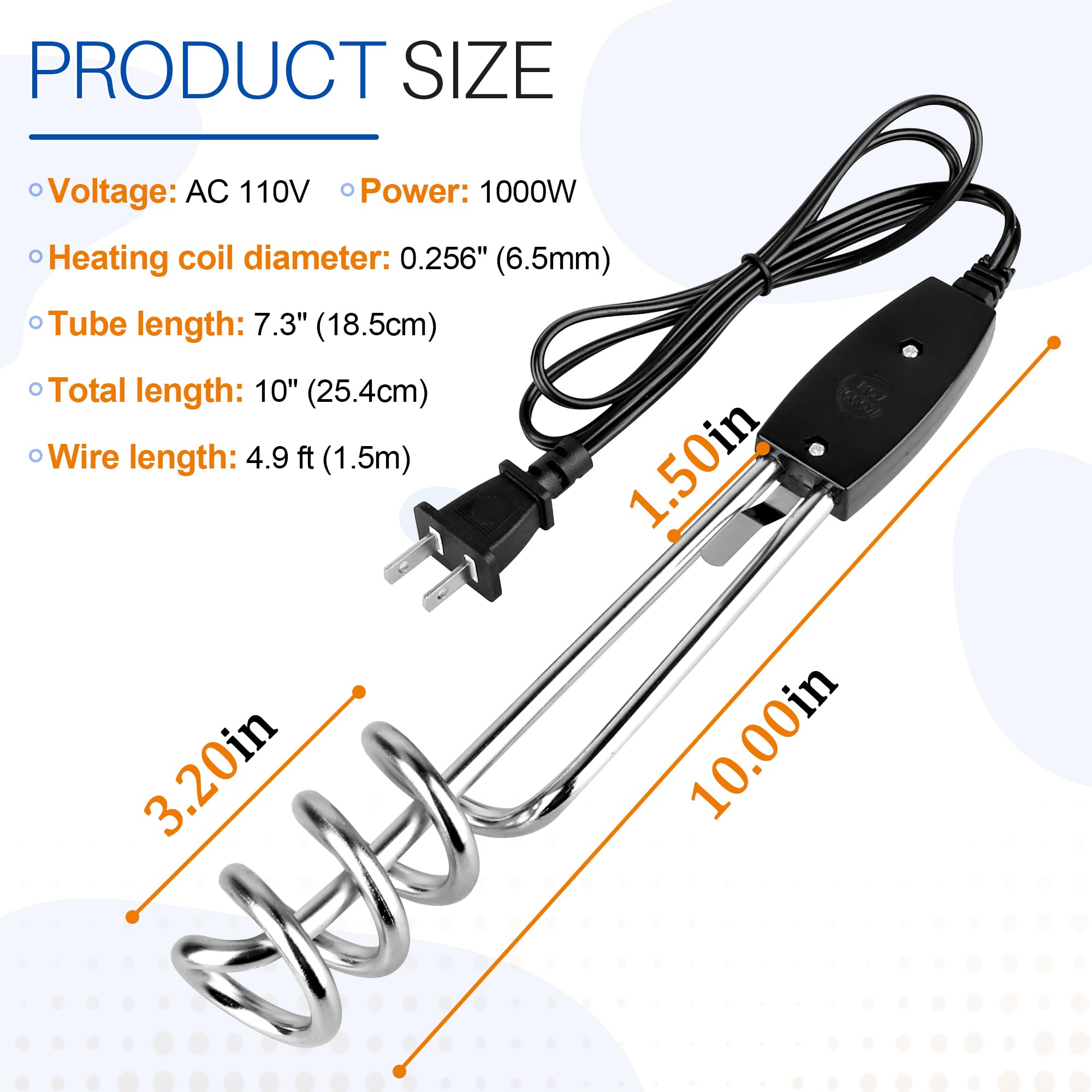 【Durable Specification】Made of high-quality iron material, this immersion water heater electric is lightweight and easy to carry, ensuring long-lasting use. Portable immersion element total length: 10", metal sheel length: 7.3", metal sheel diameter: 0.256" AC: 110 V, power 1000 W, 4.9 ft cable
