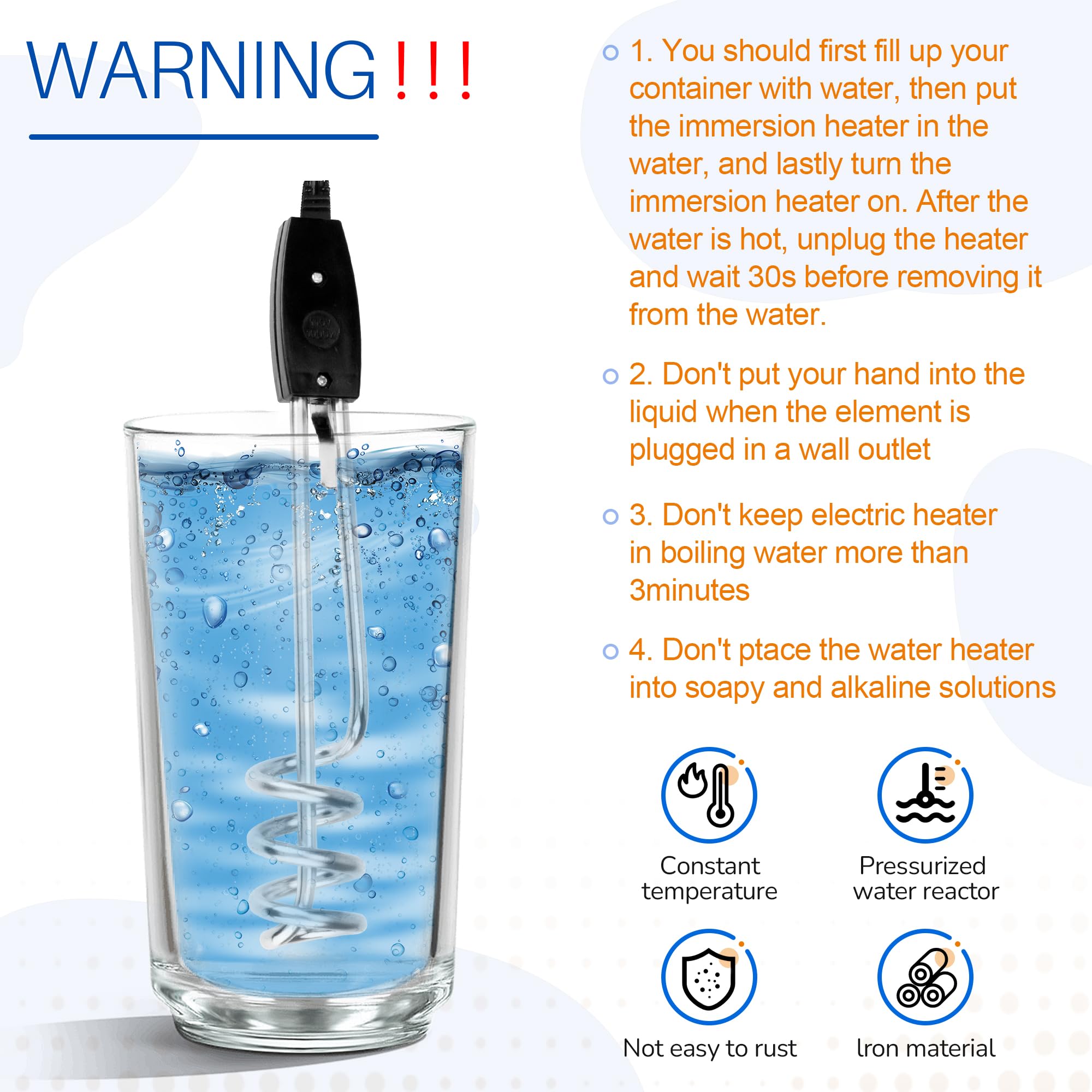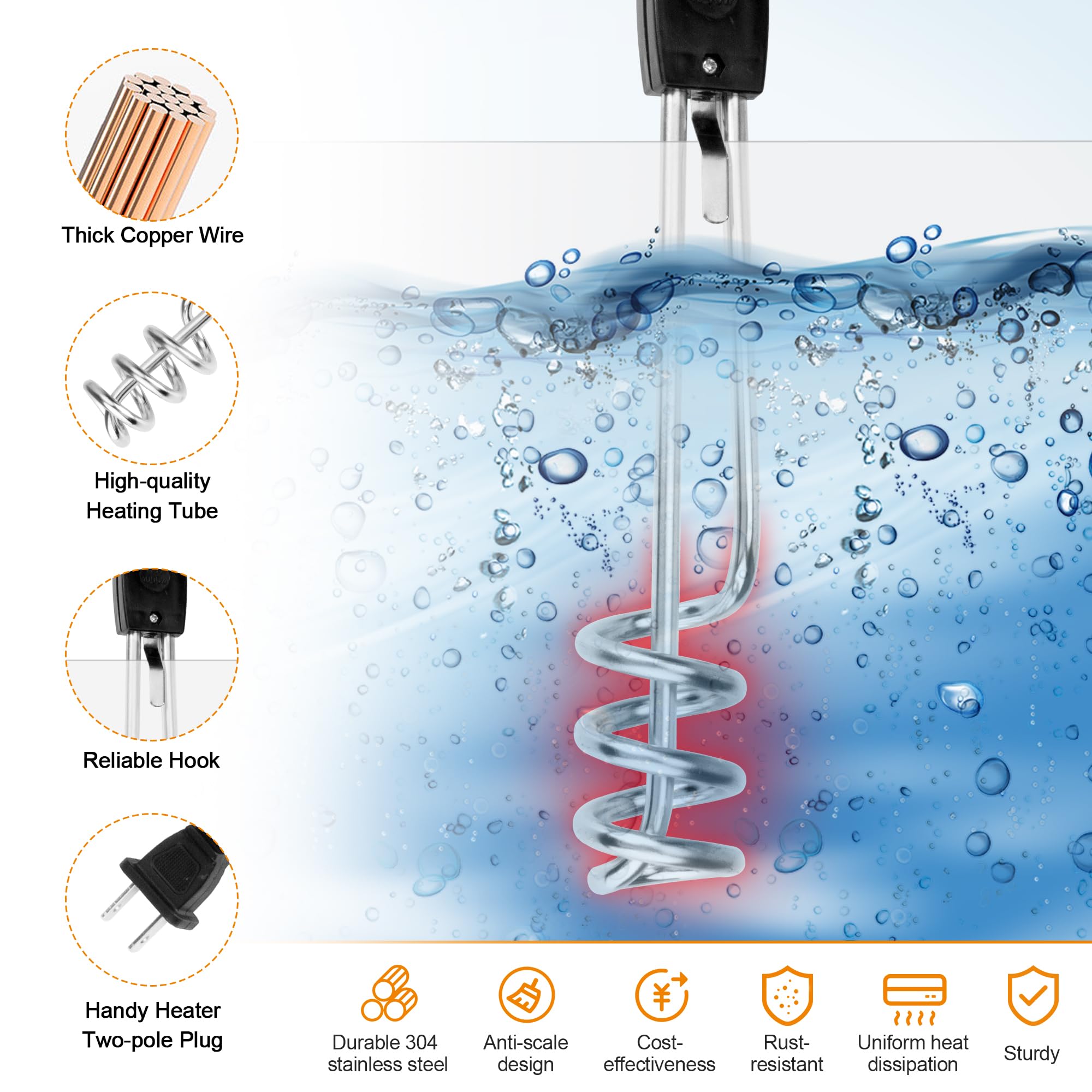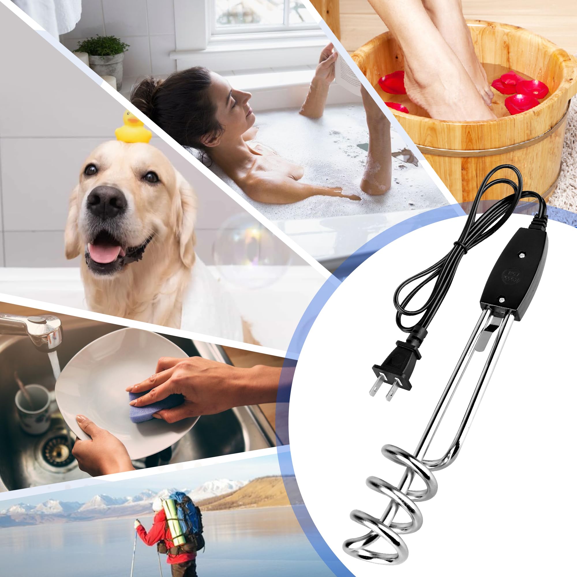 Immersion Water Heater: 1000W-110V immersion heater boiling water can be used on the farm, for bathroom sink, to heat outdoor pond, inflatable pool heater, bucket heater. Ideal for home, office and travel. This portable electric water heater is your reliable companion. Enjoy a warm cup of tea, heat up water for cooking, or even sanitize your utensils with ease.