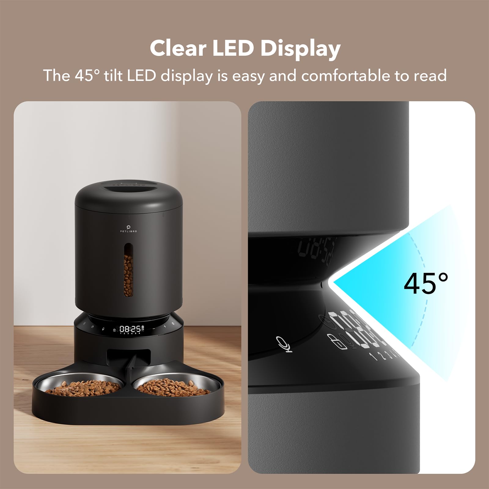 Easy to Set up and Program: PETLIBRO timed cat feeder can set 1-6 meals daily and up to 50 portions per meal (20ml each portion). Use the easy-to-read tilt LED panel to adjust your pet's feeding schedule and monitor battery power. The Granary auto cat feeder is also equipped with a manual feeding button to easily reward your pet (up to 5 portions).