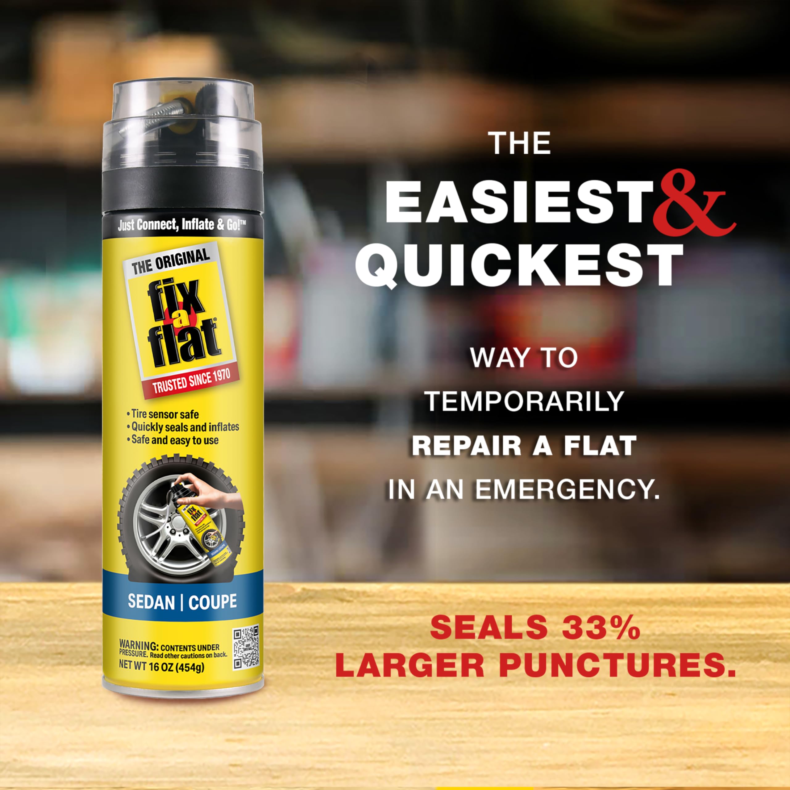 Fix-A-Flat Aerosol Tire Inflators seal punctures and inflate the tire in seconds without the need for a jack, spare tire, or any tools, allowing you to get off the road and to a service station where an approved repair can be made. This non-flammable formula is easy and safe to use, and cleans up easily with water. Fix-A-Flat Aerosol Tire Inflators are the cheapest and quickest way to repair a flat tire in an emergency. Fix-A-Flat Aerosol Tire Inflators are designed to seal small tire punctures and provide enough inflation to lift the rim off the ground.