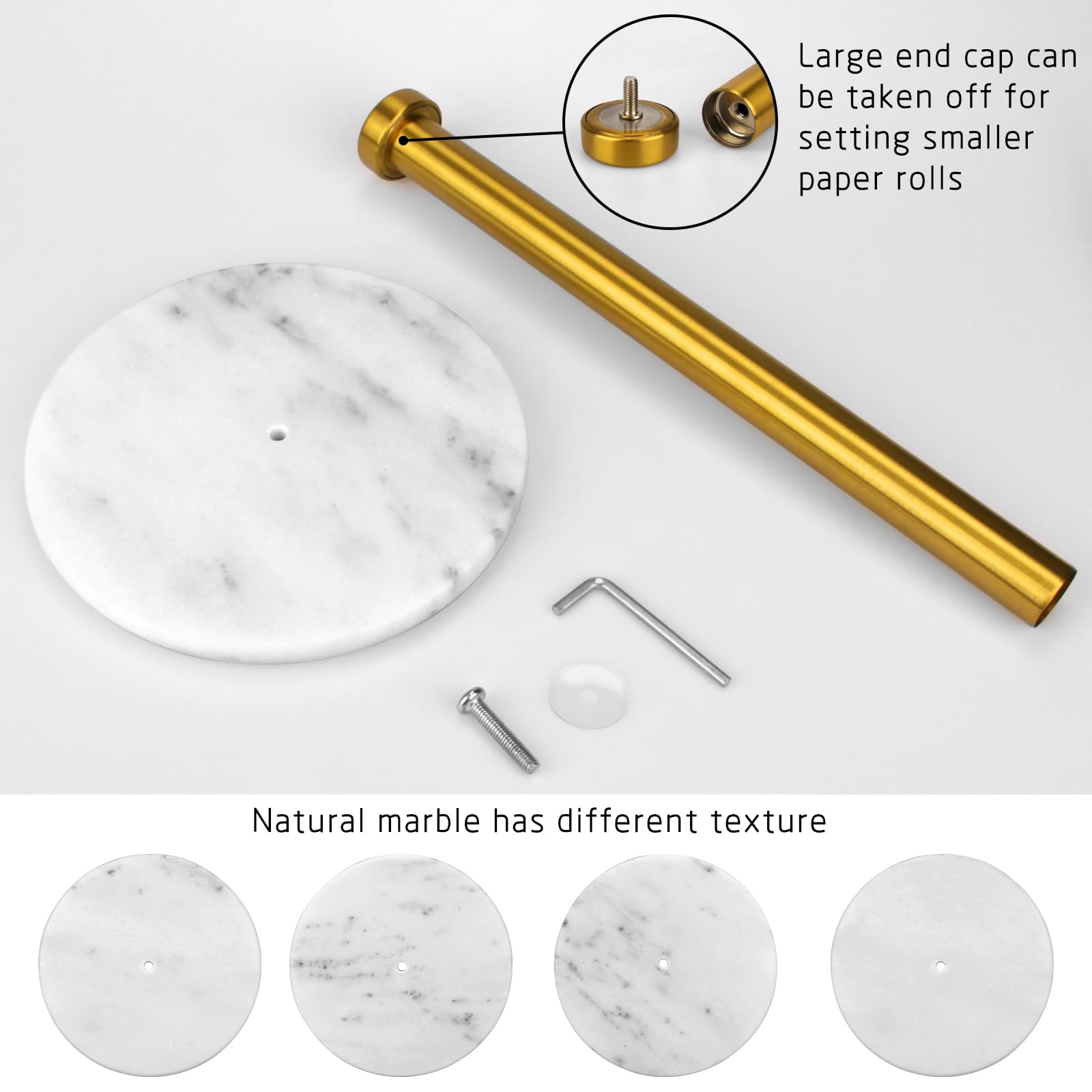 CARE: Natural marble and metal paper towel holders require minimal maintenance to keep them looking their best. The marble base should be cleaned with a damp cloth and mild soap, while the metal component can be wiped down with a soft cloth to prevent scratches.