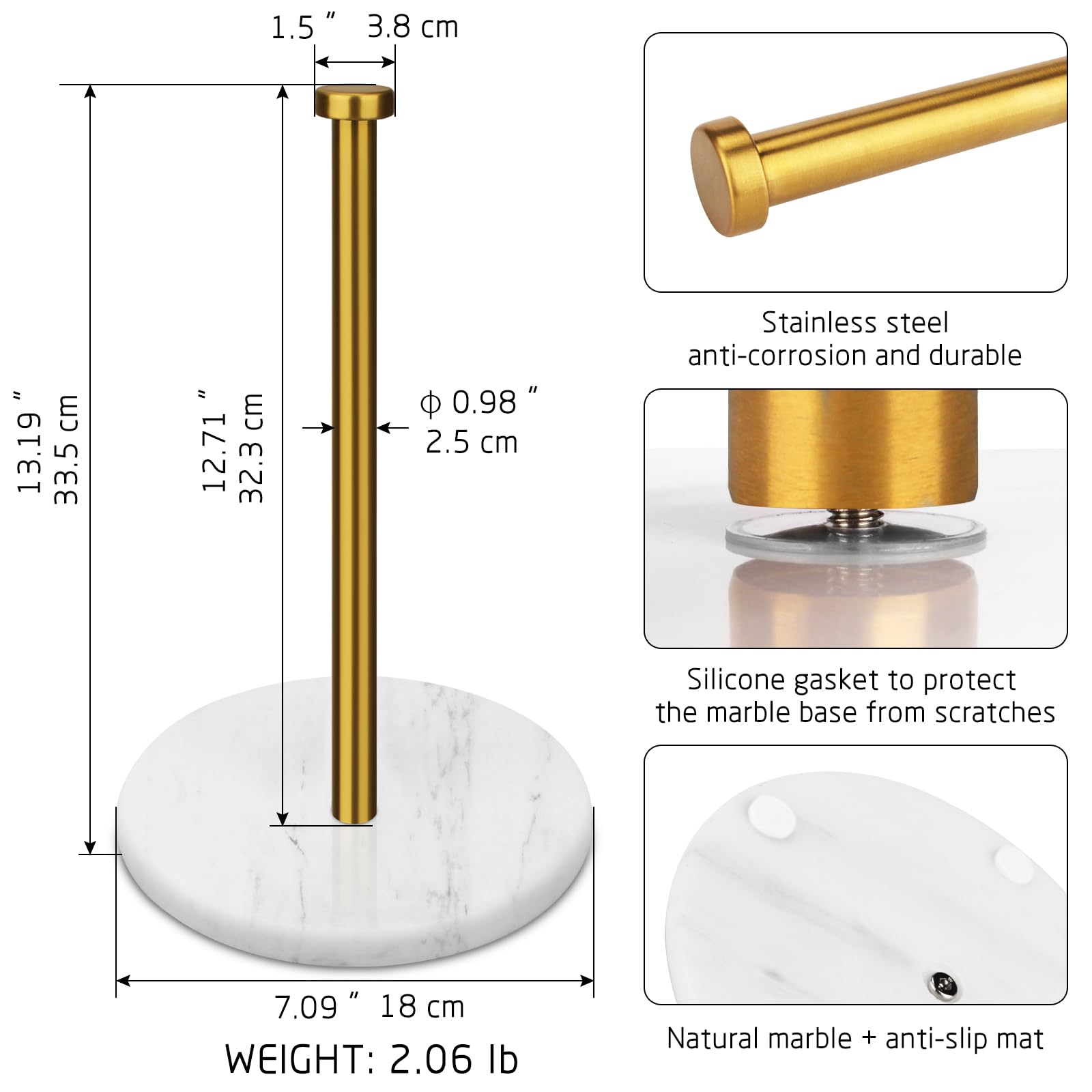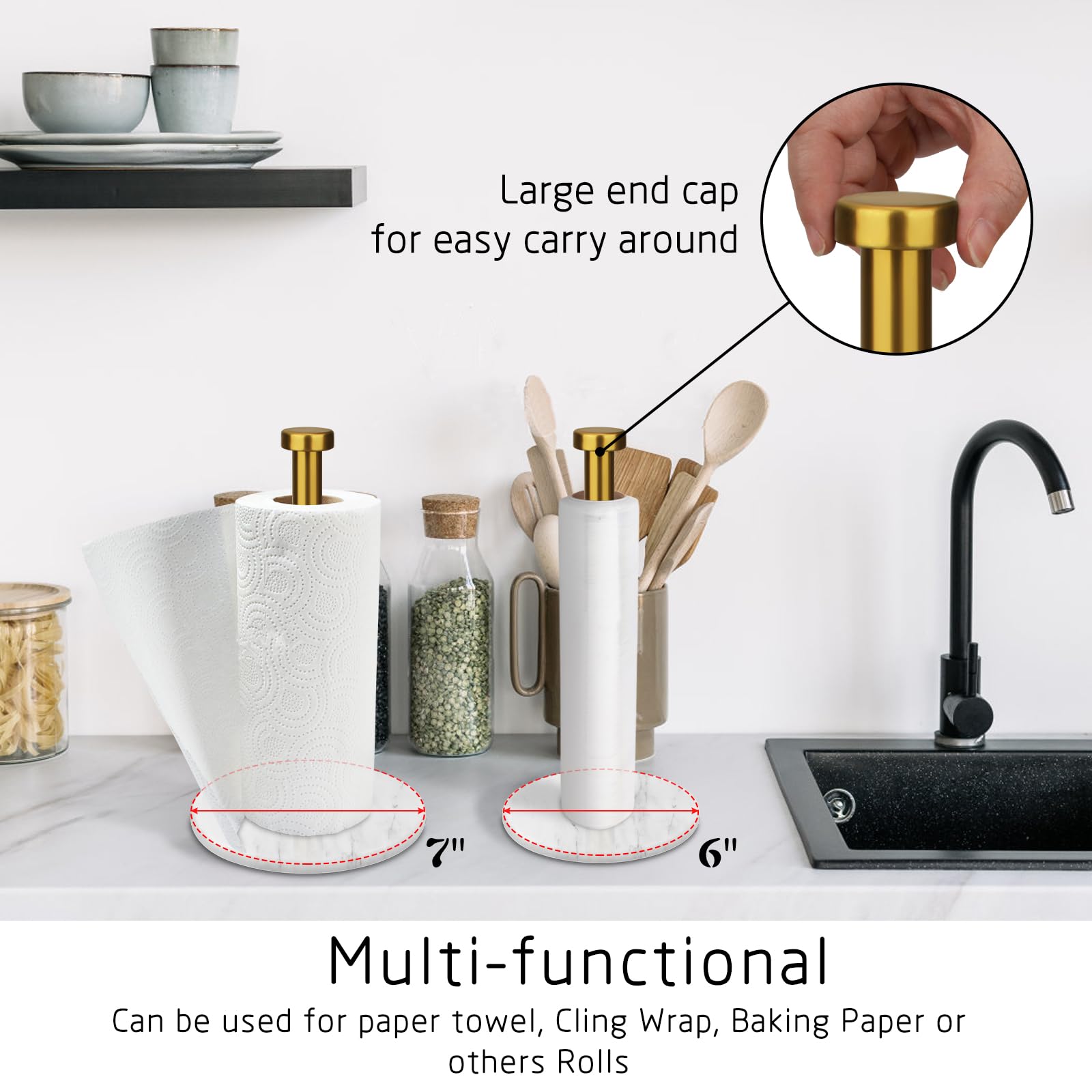 VERSATILITY: We also put 4 non-slip pads on the bottom to prevent the paper towel holder shelf from shifting. The padded bottom will keep your table from getting scratched.Our paper towel bars come in different marble bases, and different metal bars, so you can best match the style of your home.