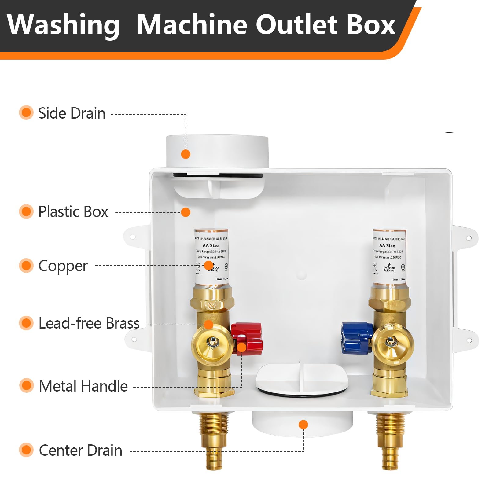 PACKAGE INCLUDE:1.washing machine outlet box,Equipped with a copper arrestor. 2.pre-installed support brackets 3.protective box cover.