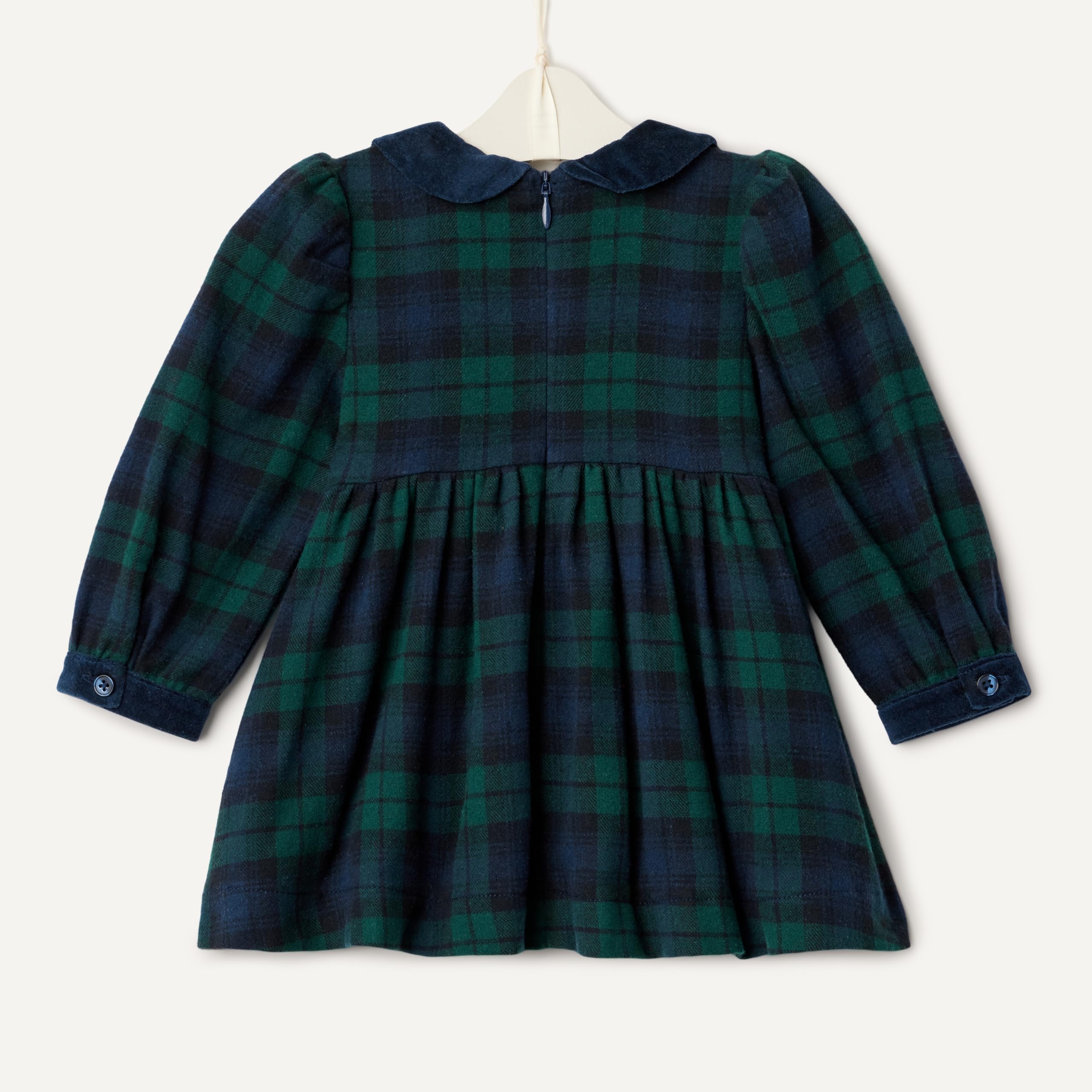 DETAILS: Smocked front bodice with gathered skirt, contrast velvet collar, long sleeves with velvet cuffs, button-back closure, fully lined