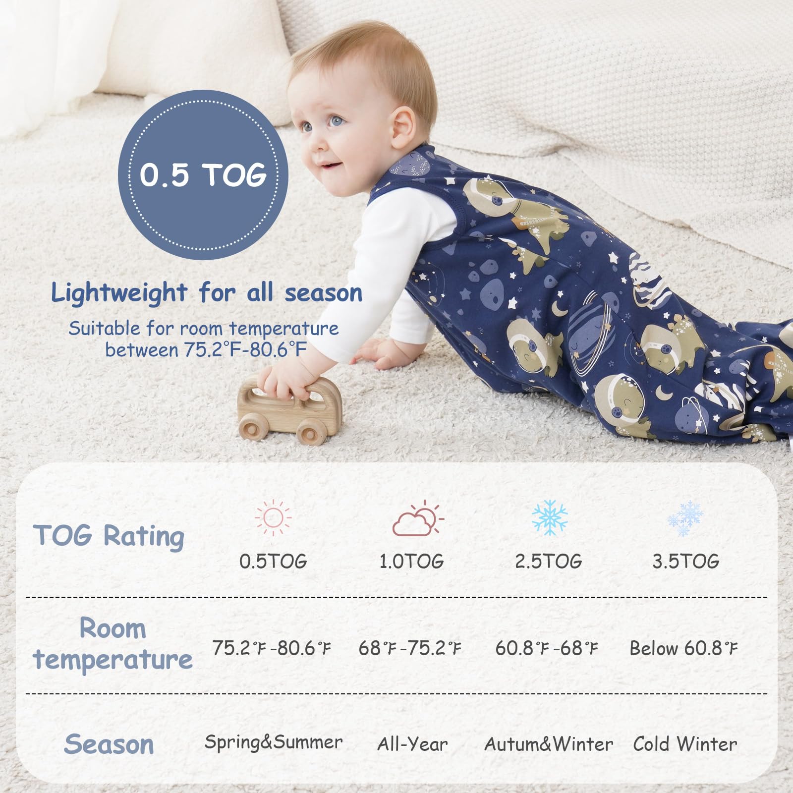 Lightweight 0.5 TOG : 0.5 Tog baby sleeping bag is suitable for moderate temperatures of 75 to 80°F, which is an ideal choice for spring, summer, autumn or naps in air-conditioned rooms, helping to maintain a stable body temperature. The sleeveless design keeps your baby warm and comfortable while reducing the risk of overheating.