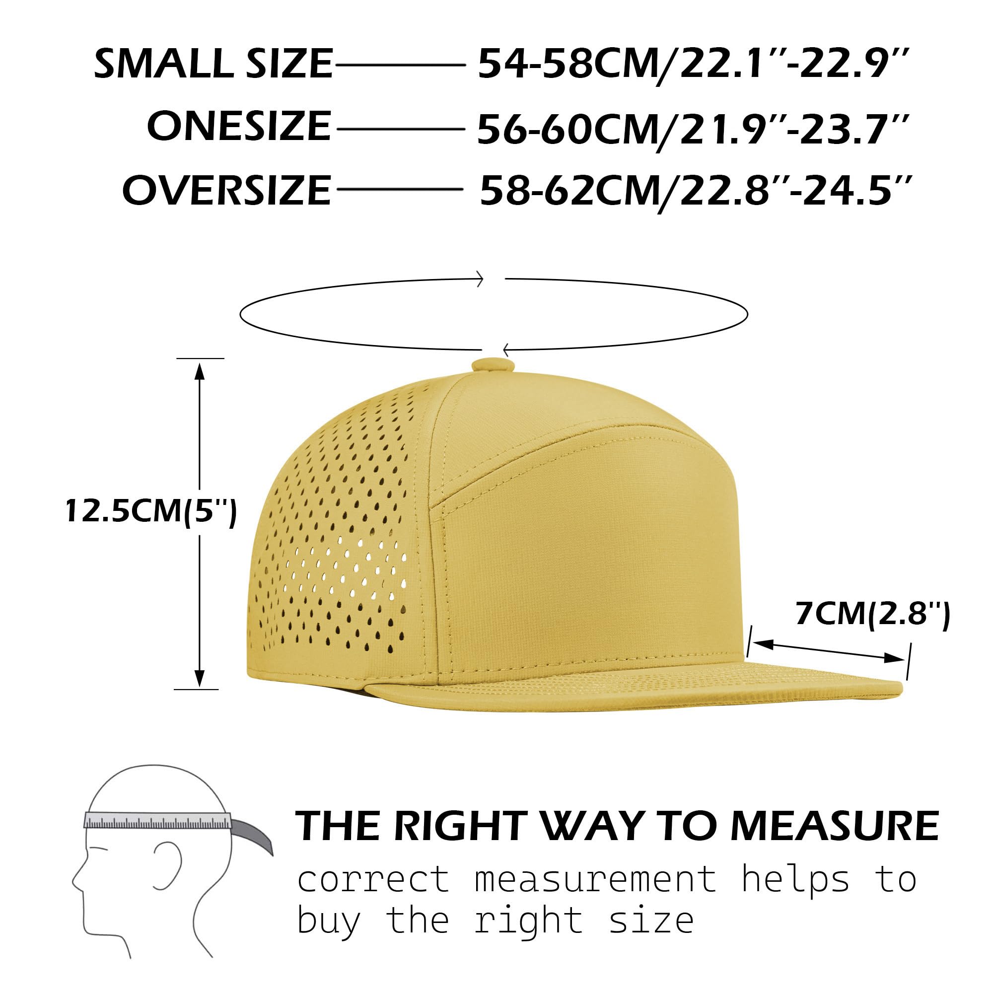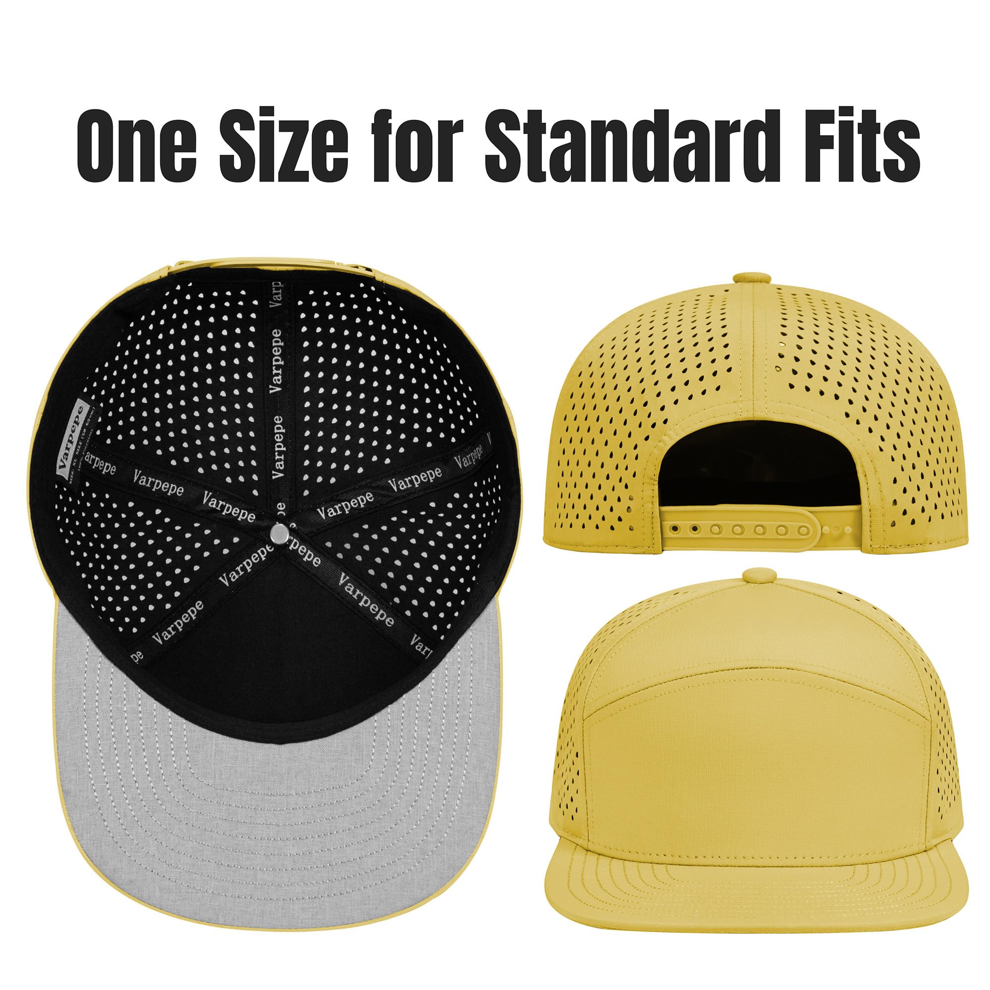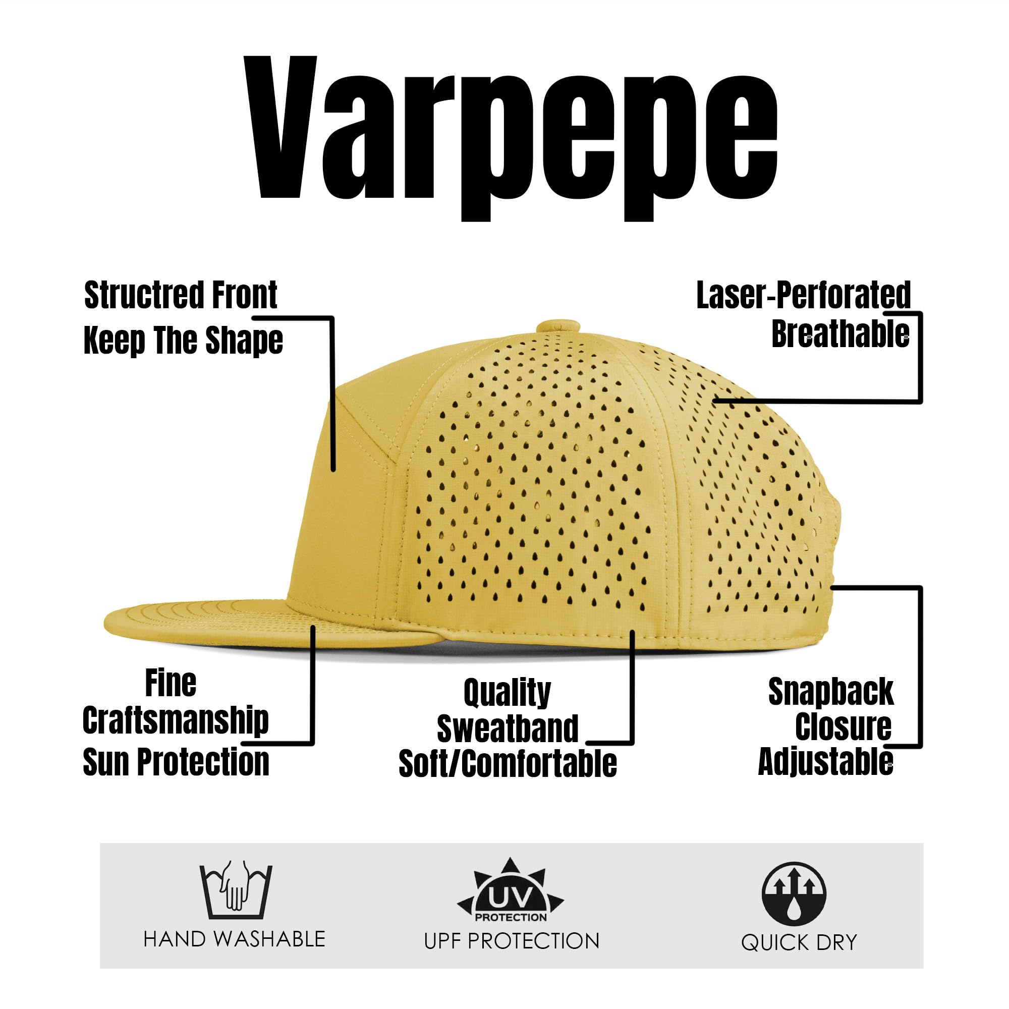 Varpepe Hat Design: Stylish and functional,structured front panels that maintains shape, 6-panel, flat brim, laser-perforated side & rear panels for breathability, and soft touch adjustable snapback closure