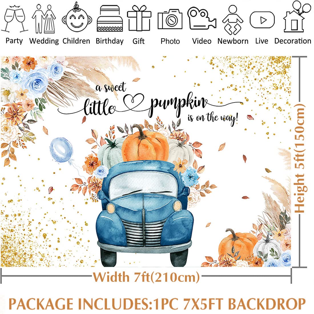 Pumpkin Baby Shower Backdrop: This blue truck pumpkin backdrop is perfect for fall baby shower, little pumpkin baby shower decorations; Also applied in occasions like family gathering, festivals, home decor; Professional photography like product photography, baby mini session, artistic portraits and DIY photo booths