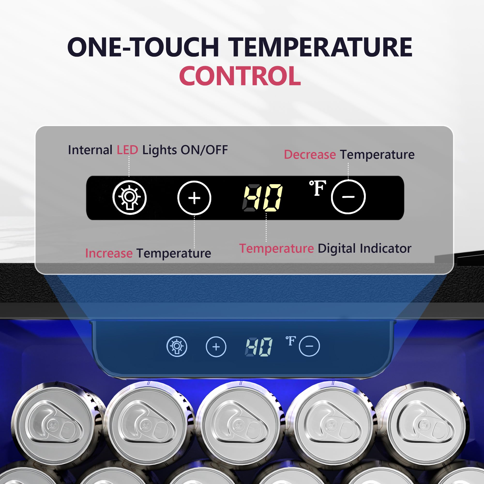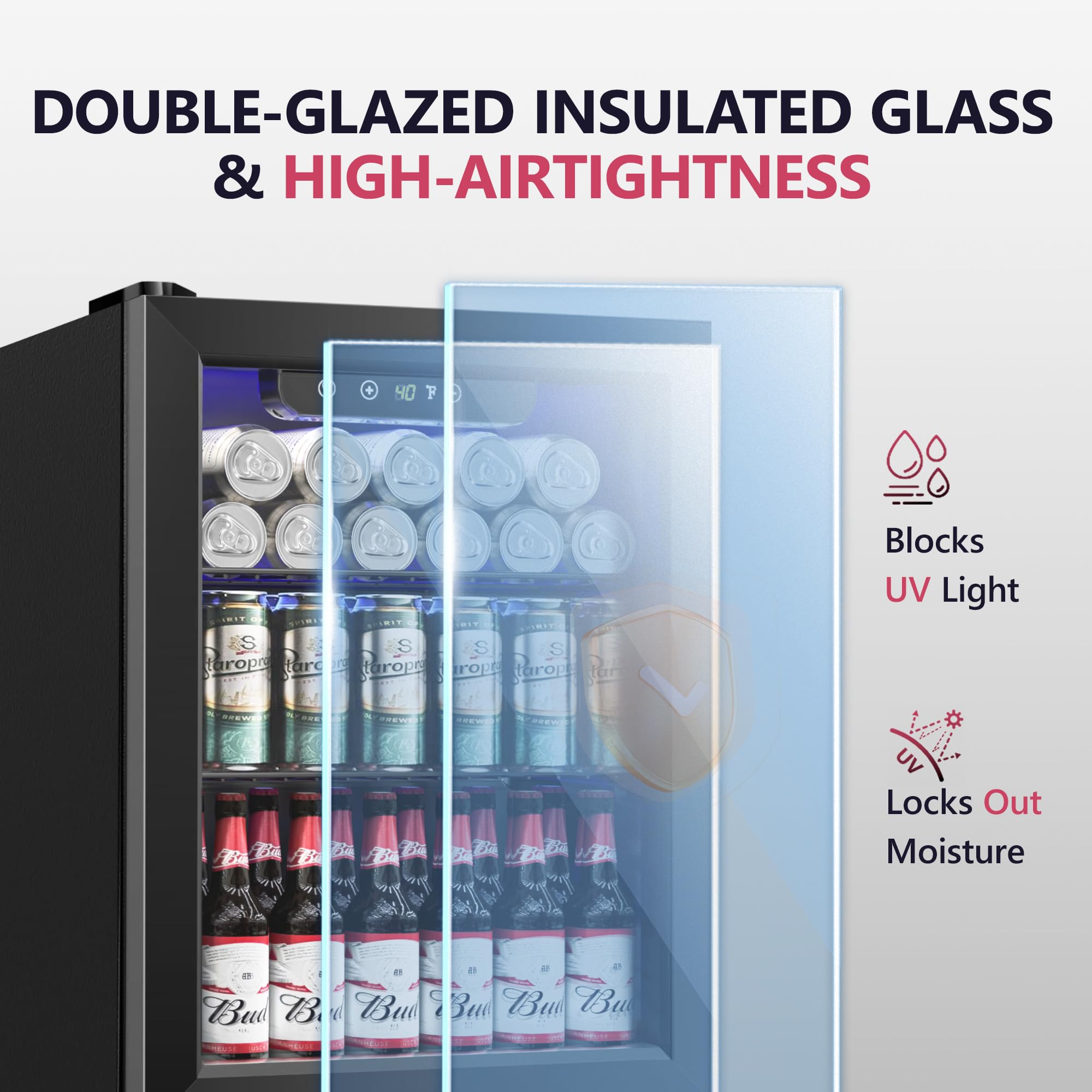 【Precision Digital Control for Ideal Chill】 Keep drinks in mini refrigerator crisp and refreshing with easy-to-use digital temperature control (40°F–61°F) . The double-pane glass of small fridge features airtight seals and Low-E insulation to block heat transfer while preventing condensation—ensuring temperature accuracy with energy savings.