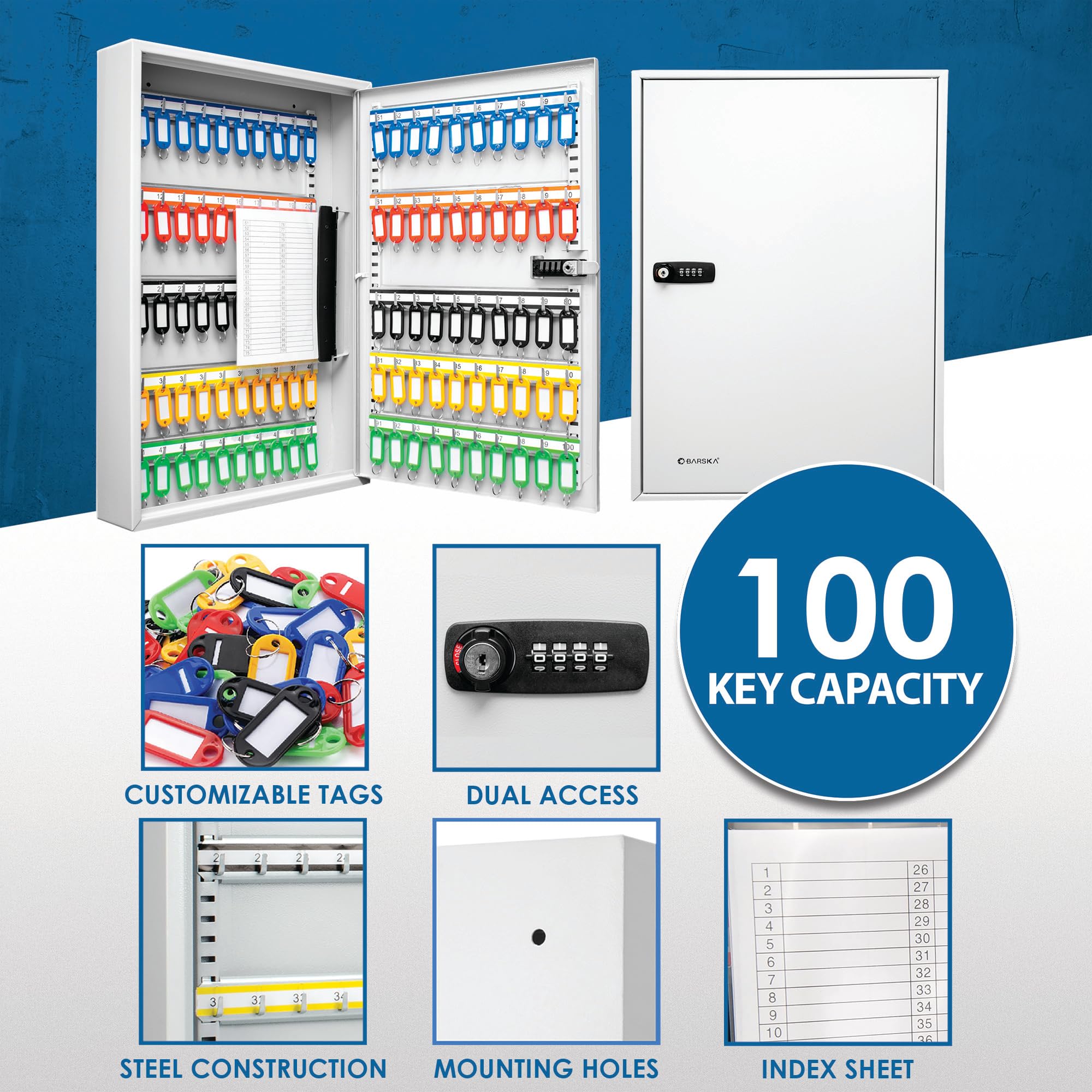 The 100 Keys Adjustable with Combination Lock, Grey by Barska features a hook-style cabinet that makes key organization easy and convenient. Inside the cabinet, are five rows of color-coded and numbered hooks, each of which are easy to access and to keep track of, thanks to the included key index. The two-sided index chart has ample room to document the keys hook position corresponding lock, and a drop-in plastic sleeve tethered to the hinge inside the safe provides a hands-free reference. The 100 Keys Adjustable with Combination Lock, Grey by Barska has pre-drilled anchor holes and including mounting hardware for quick installation. The safe's exterior is constructed of 0. 8mm solid steel and finished with a grey coating. This lock box is ideal for home, office, apartment complex, rental management companies, car lots, body shops, and many more. All Barska cabinets are backed by a One-year limited .