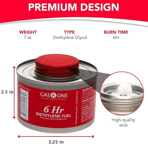KEEP YOUR FOOD READY TO SERVE - Make sure your food stays warm for family and friends with Gas Oneβs Diethylene 6 HOUR chaffing fuel cans. Perfect for catering and large food setups, Gas Oneβs Chafing Fuel is the perfect tool for those wanting to keep their food warm with an easy-to-use, long lasting flame