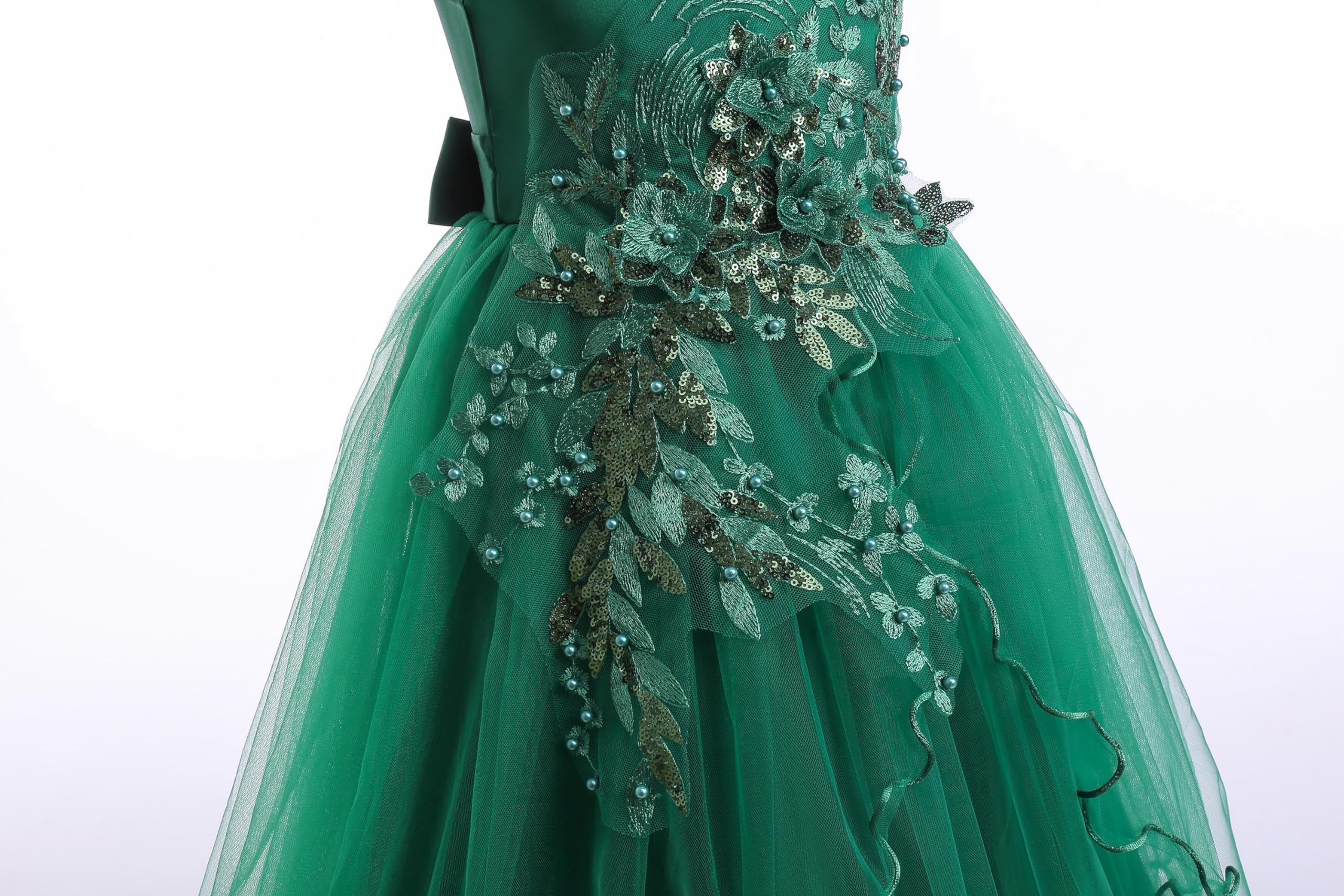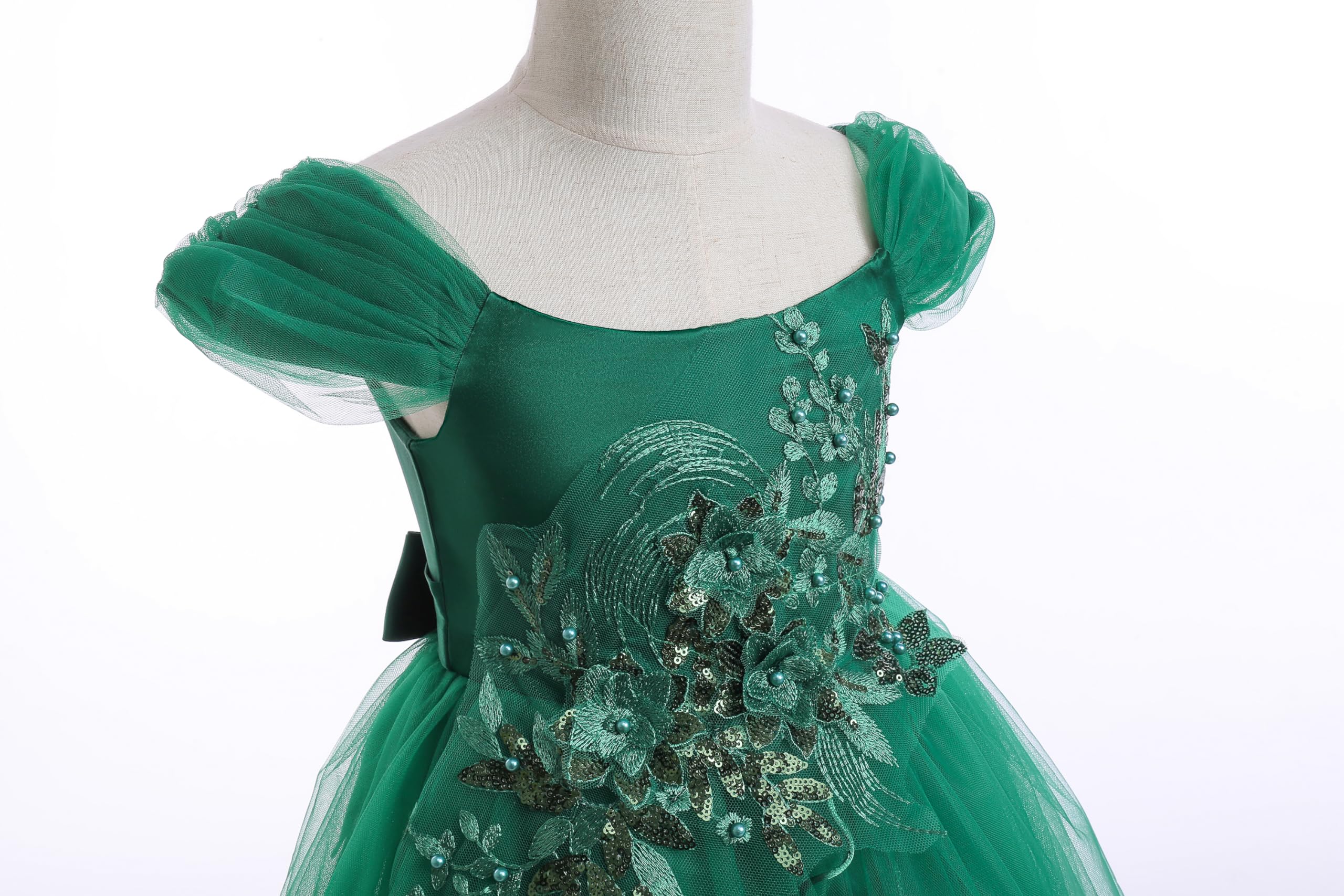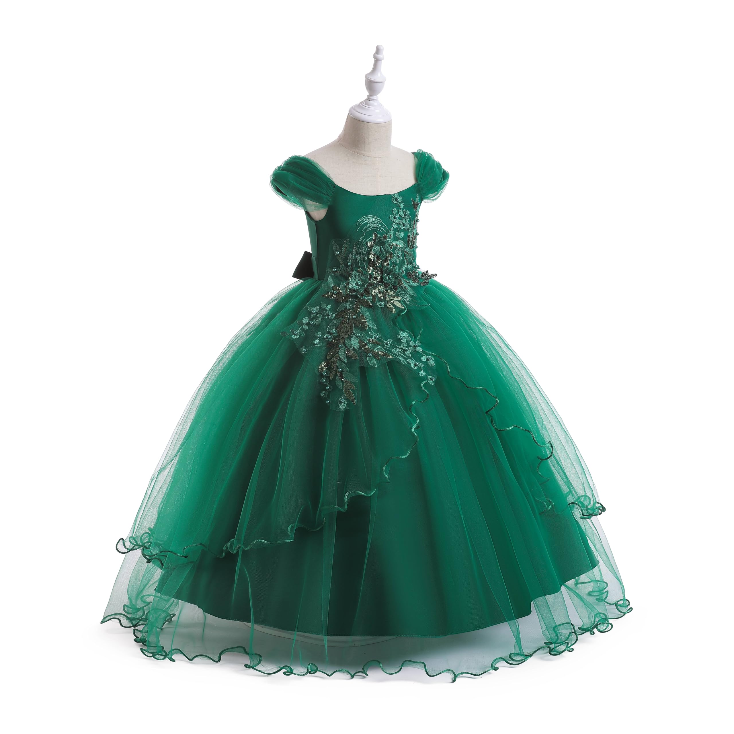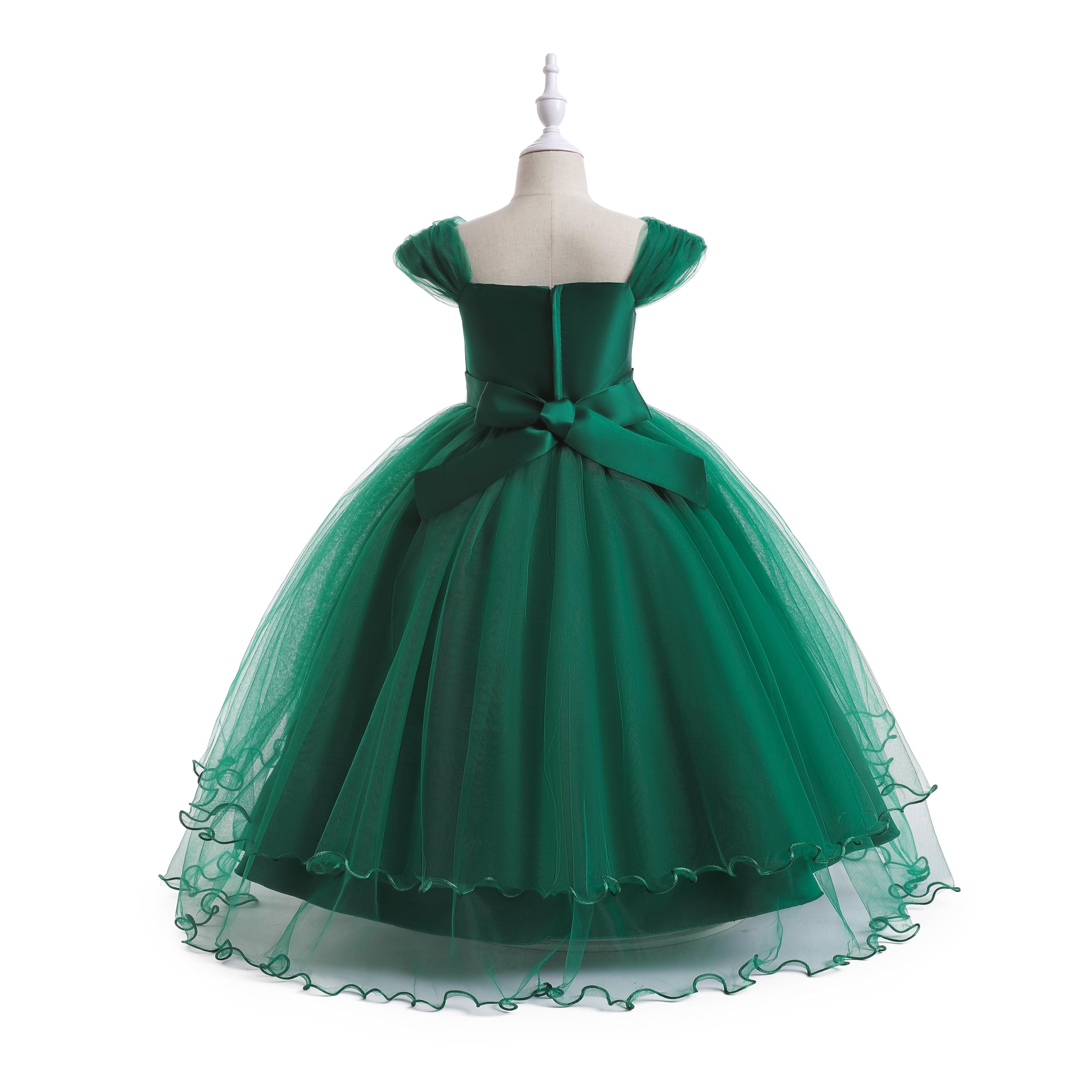 Style: Weileenice dark green holiday dresses for girls, girls ball gown green. 3D lace flowers, cold shoulder dress, ankle length, semi-fixed lace pieces, A-line maxi dress, hidden zip on the back, the sashes attached at the side seams can be tied a bowknot at the back. Classical elegant shoulder design, the shoulders have a fluffy tulle with elastic straps inside. Exquisite lace embroidery adorns the chest and waist, with delicate accents, multi-layer tulle making the dress more gorgeous