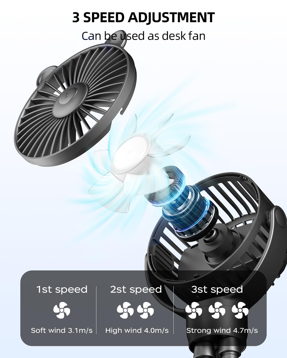 3 SPEEDS & ROTATABLE HEAD: The stroller fan has 3 wind speeds (low/medium/high) and a 360°rotatable head, you can adjust the wind direction to suit your needs and keep cool in any position.