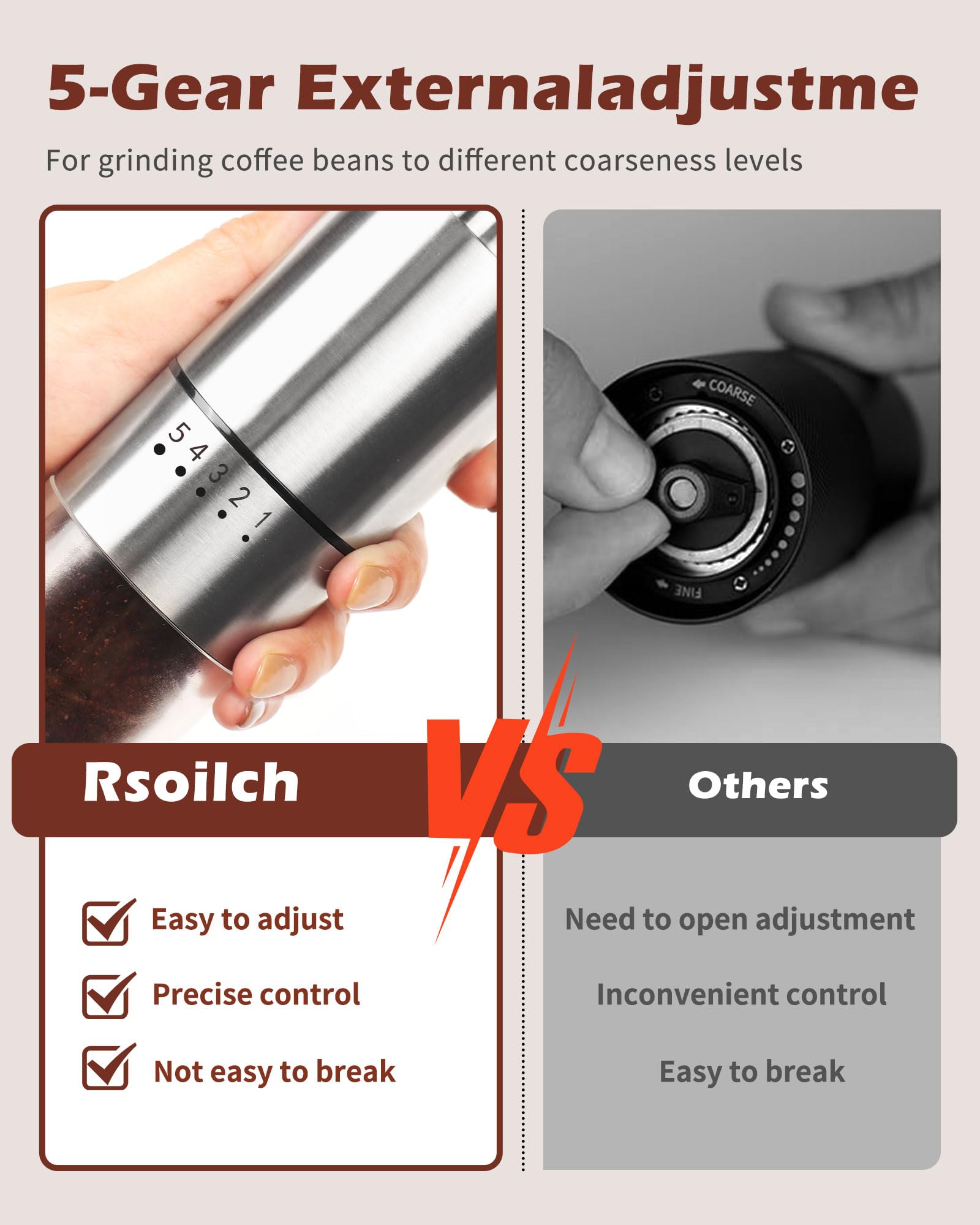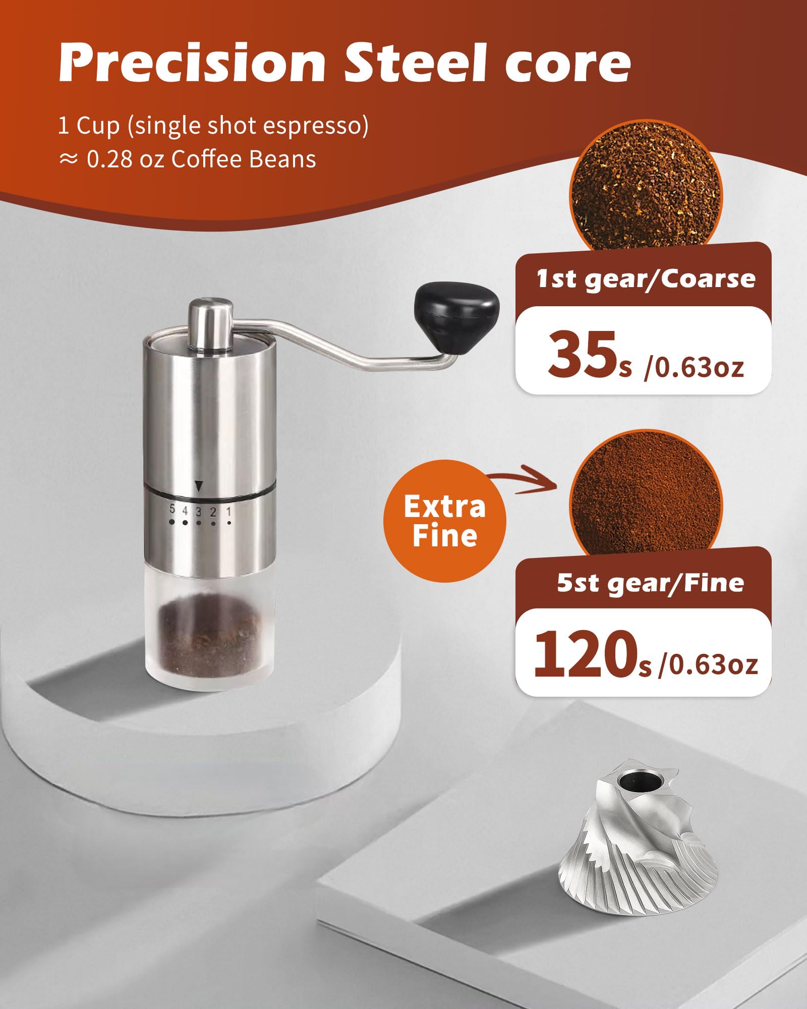 Precise Grinding: With 5 adjustable settings, this grinder ensures a consistent grind size from coarse to fine, ideal for French press, pour over, cold brew, and more.