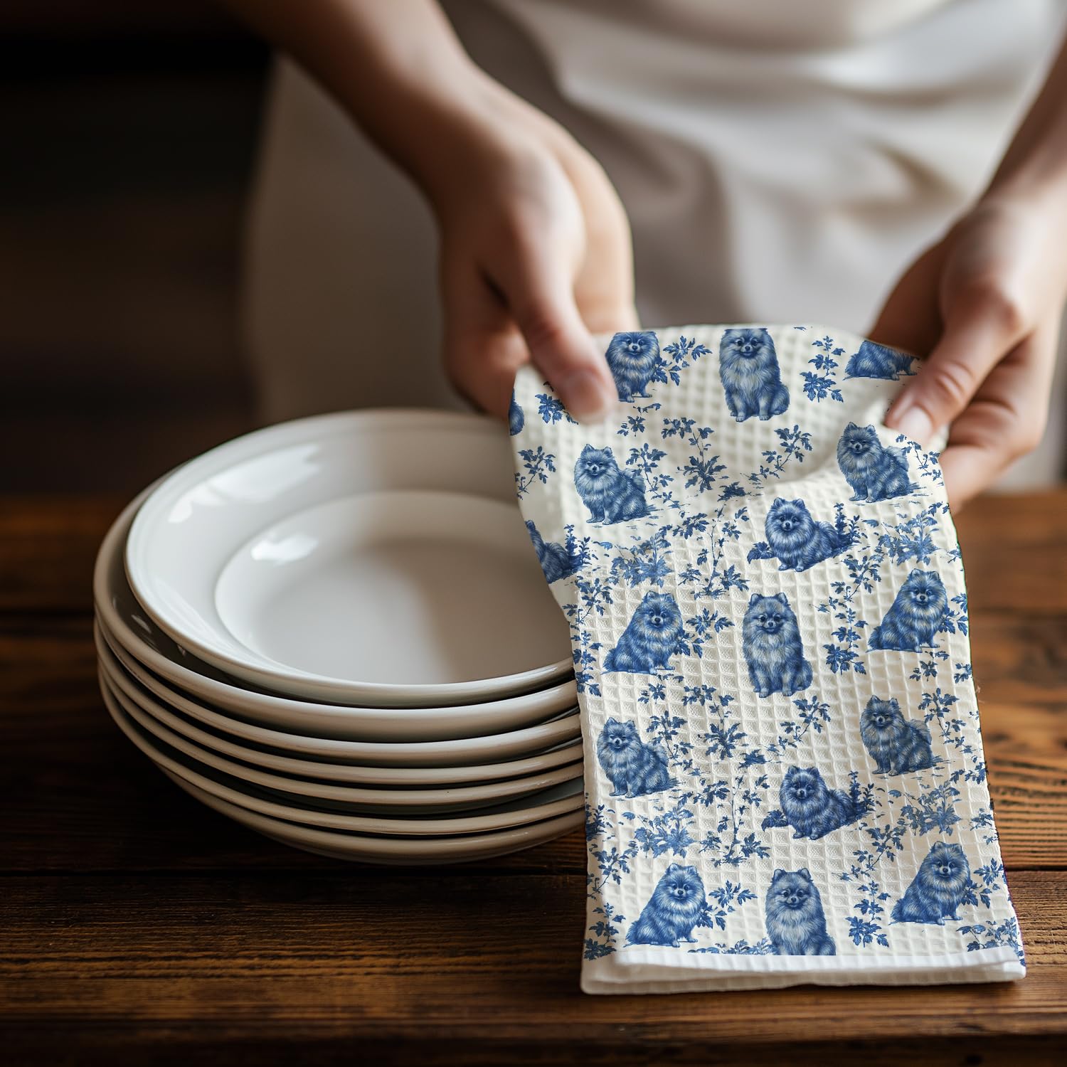 Add a refined yet playful charm to your kitchen or bathroom with this Chinoiserie Pomeranian Kitchen Towel. Crafted for dog lovers who adore timeless patterns, this towel showcases fluffy Pomeranians surrounded by vintage-inspired blue floral illustrations. Perfect as a housewarming gift, dog mom present, or seasonal kitchen refresh, this towel balances beauty and utility. Made from waffle weave microfiber, it’s soft, absorbent, and machine washable—great for daily use or simply hanging as eye-catching décor. Whether you're team farmhouse, French country, or just a Pomeranian parent, this 16x24 inch towel is the perfect way to show off your dog-loving personality with flair.