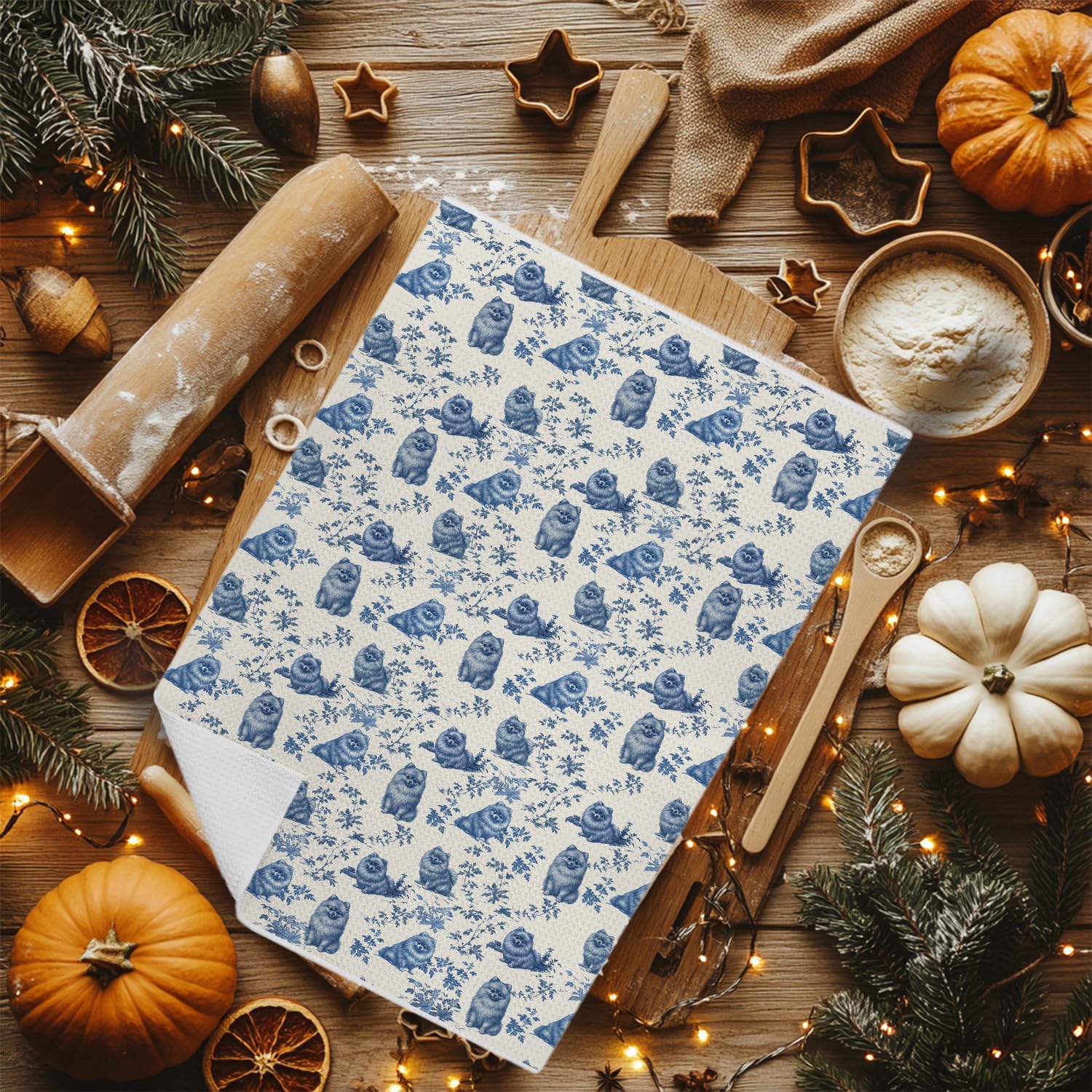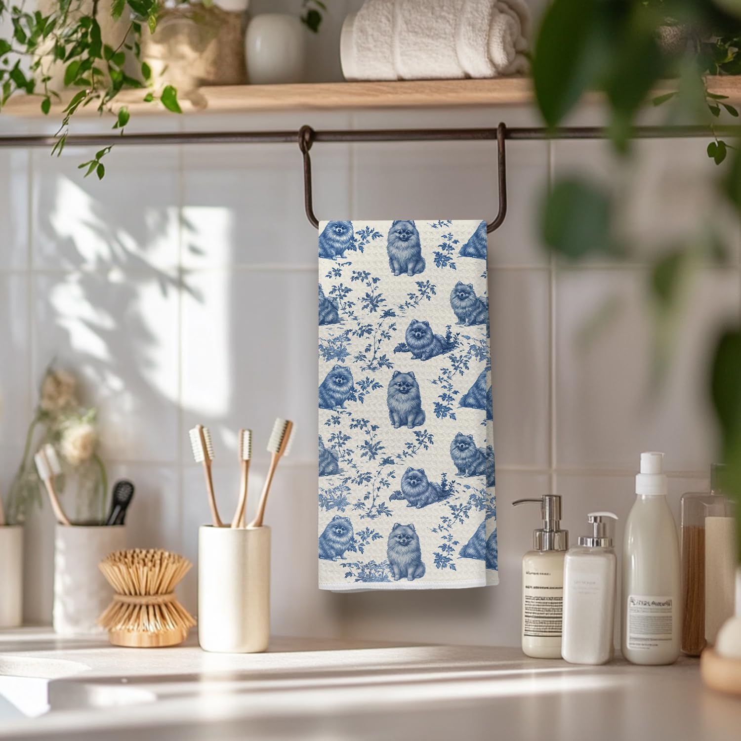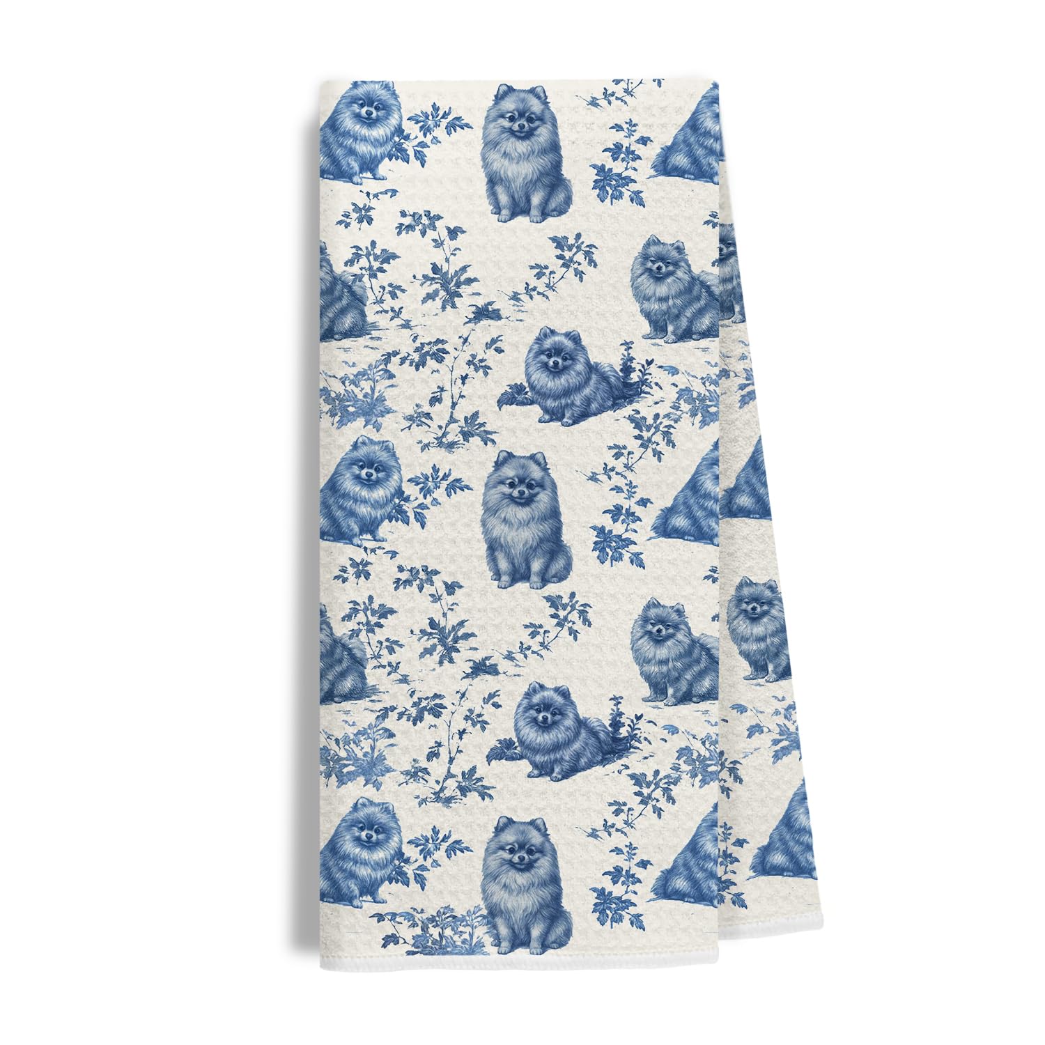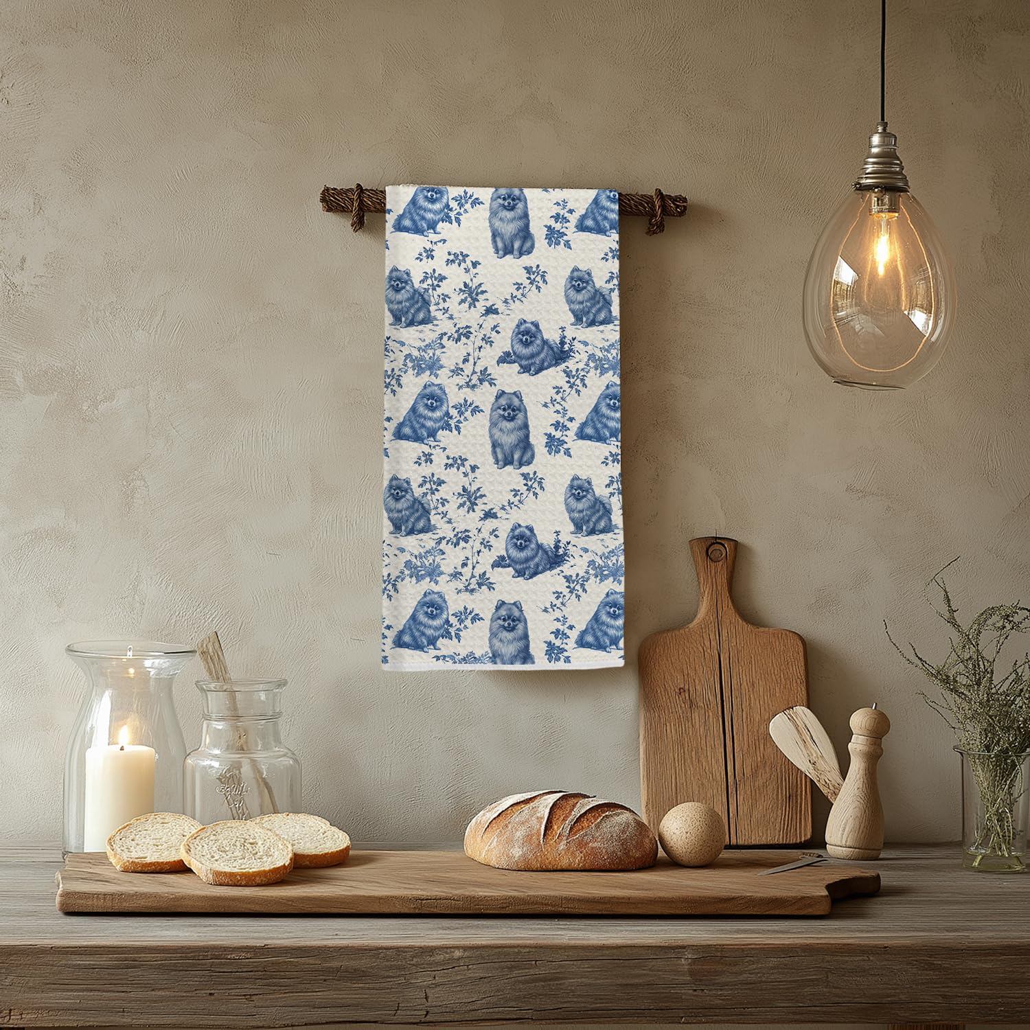 Charming Pomeranian Print This elegant towel features adorable Pomeranians illustrated in a vintage blue toile style—perfect for dog moms, farmhouse lovers, or cottagecore enthusiasts.